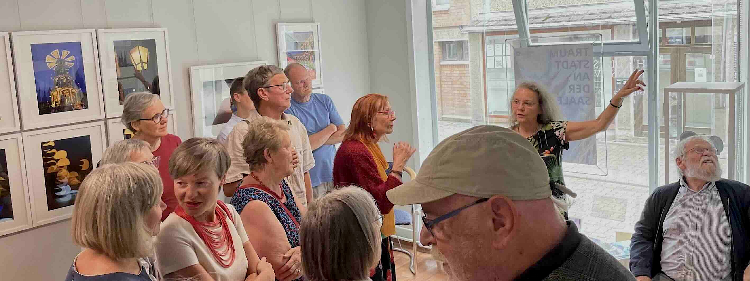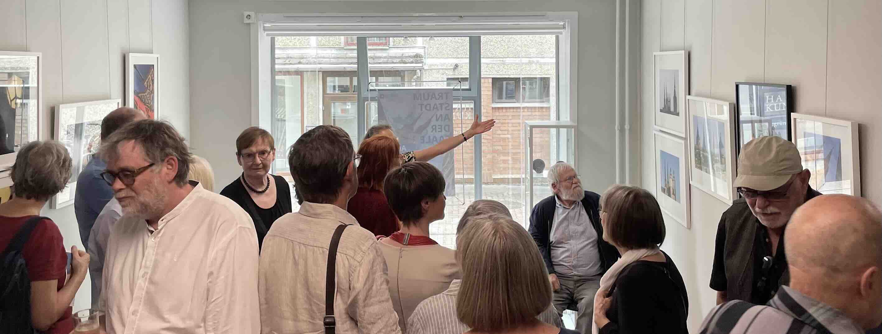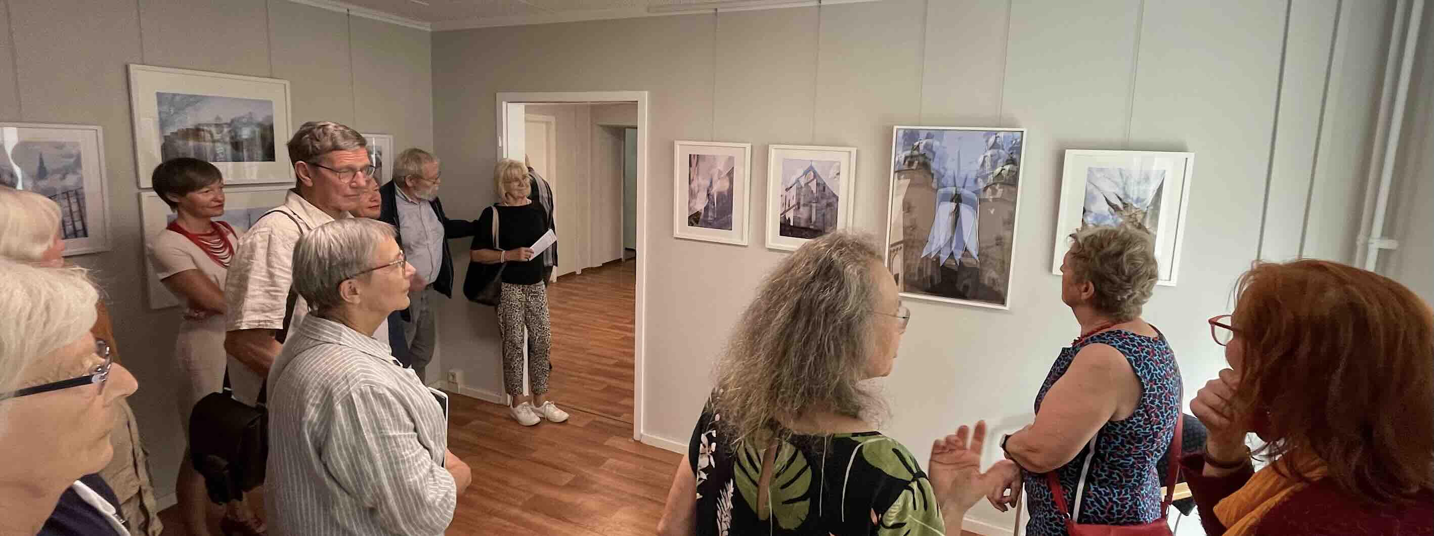 Großer Andrang im Anschluss in den Räumen der Galerie und viel Neugier bei den Besuchern der Ausstellungseröffnung auf die Bilder und die Sicht der Fotografin auf ihre/auf unsere Heimatstadt. Bei einem gemeinsamen Rundgang erläuterte Angela Dolgner ihre Sicht auf Halle, gab zu ihrer besonderen Technik der Mehrfachbelichtung Auskunft und stand für Nachfragen zur Verfügung. (Halle/S., 5.6.2025/kw)
