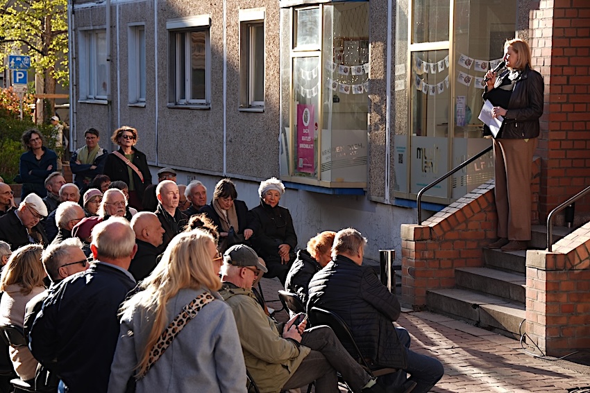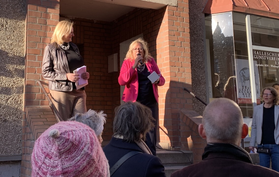 Gestern hat alles gepasst: Angenehm warmes Frühlingswetter ließ es zu, dass wir die Ausstellungseröffnung vor die Galerie verlegen konnten. Viele Vereinsmitglieder sowie beteiligte Künstlerinnen und Künstler waren gekommen, um Teil 1 des Ausstellungsprojektes neugierig in Augenschein zu nehmen. Vom Hauptsponsor der Ausstellung, Lotto Sachsen-Anhalt, konnten wir erstmals Astrid Wessler begrüßen. Und dann war in sprichwörtlich letzter Minute auch der druckfrische Katalog zur Ausstellung noch da.