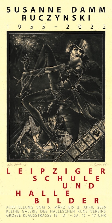 Susanne Damm, 1955 in Erfurt geboren, studierte 1974 bis 1980 an der Hochschule für Grafik und Buchkunst in Leipzig und wird vom dortigen genius loci der Leipziger Schule befeuert. Sie steht in der Tradition von Heisig, Tübke und Mattheuer, von Rink oder Zander. Zudem sah die sich als kreative Verbündete von Schriftstellern und Dichtern. Mit deren Werken setzte sich Damm intellektuell auseinander und schuf eigenständige Reflektionen voller Anspielungen und Verschlüsselungen. Dabei zog die Künstlerin alle Register ihrer virtuosen Meisterschaft. Arbeiten zu Heinrich Manns „Professor Unrat“ und besonders zu Erich Kästners „Fabian“ zeugen von einem sehr individuellen Blick auf das Wesen dieser Texte, die Damm wachen Geistes analysiert und mit der ihr eigenen Fantasie in filigrane, oft verschlüsselte Bildwerke übersetzt. Vergleichbar lesen sich auch ihre Halle-Bilder. Seit 1980 war Susanne Damm-Ruczynski freischaffend in Leipzig und Halle als Malerin, Grafikerin, Illustratorin und Gerichtszeichnerin tätig.