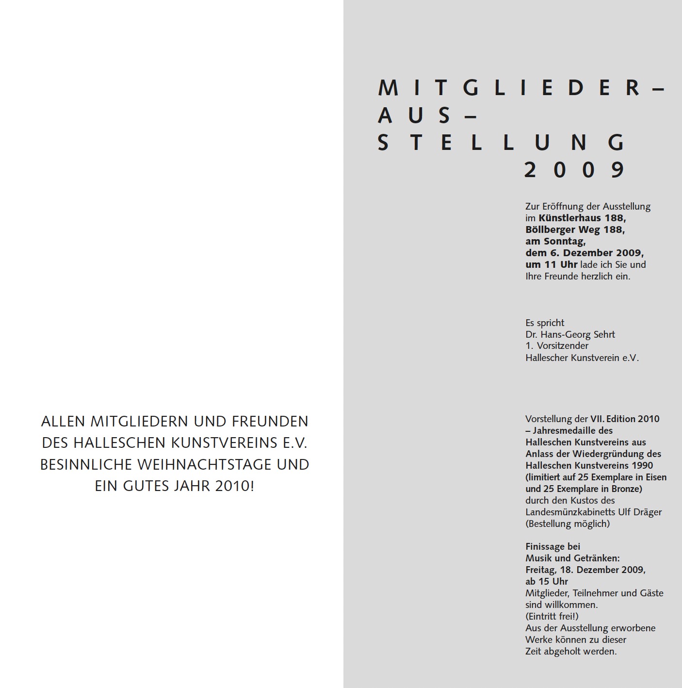 Die seit Jahren zur Tradition gewordene Mitglieder-Ausstellung des Halleschen Kunstvereins gegen Ende des Jahres findet auch diesmal wieder im halleschen Künstlerhaus 188 statt. Daran sind der überwiegende Teil der weit über 100 Künstler-Mitglieder des Vereins mit neuen Werken aus fast allen Bereichen der bildenden und angewandten Kunst beteiligt. Dadurch, dass wie auch in den vergangenen Jahren wieder professionell tätige Künstler zusammen mit Laien ohne Vorbehalte ausstellen, ergibt sich eine sehr vielgestaltige und reizvolle Schau. In Vorbereitung auf Weihnachten besteht auch wieder die Möglichkeit, Kunstwerke als Geschenke aus der Ausstellung zu erwerben.