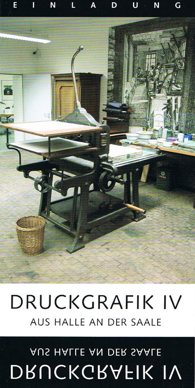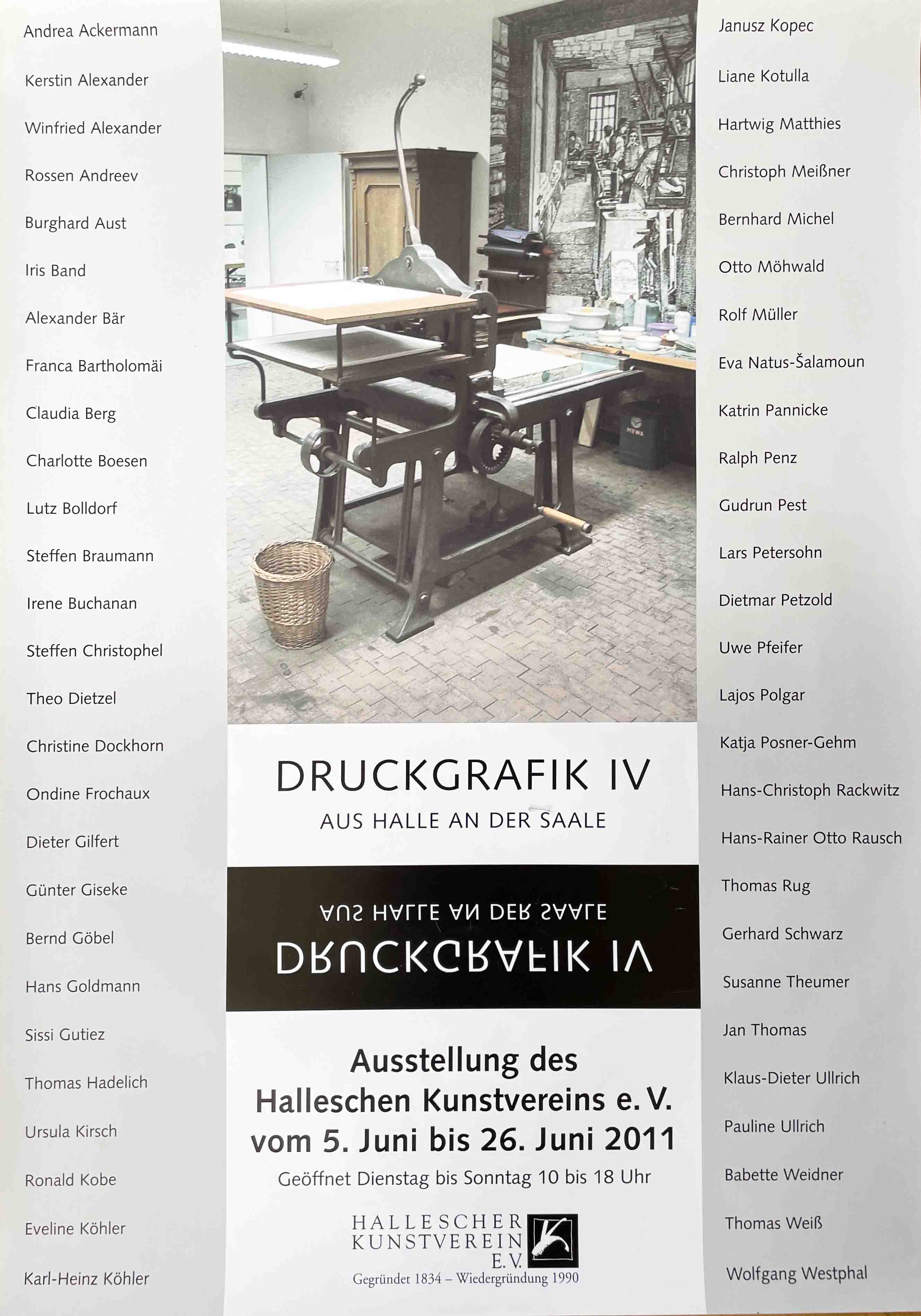 1990/91 als „Grafik aus Halle“ — damals noch mit Zeichnungen, Aquarellen u. ä. breiter angelegt — begonnen, getragen vom Verband Bildender Künstler e.V., haben wir uns dann überlegt, uns auf die Druckgrafik zu konzentrieren. So gab es 1996 „Druckgrafik aus Halle an der Saale“, 2001 dann „Druckgrafik II aus Halle an der Saale“, im Jahr 2006 „Druckgrafik III aus Halle an der Saale“ und nun ganz folgerichtig 2011 „Druckgrafik IV“.