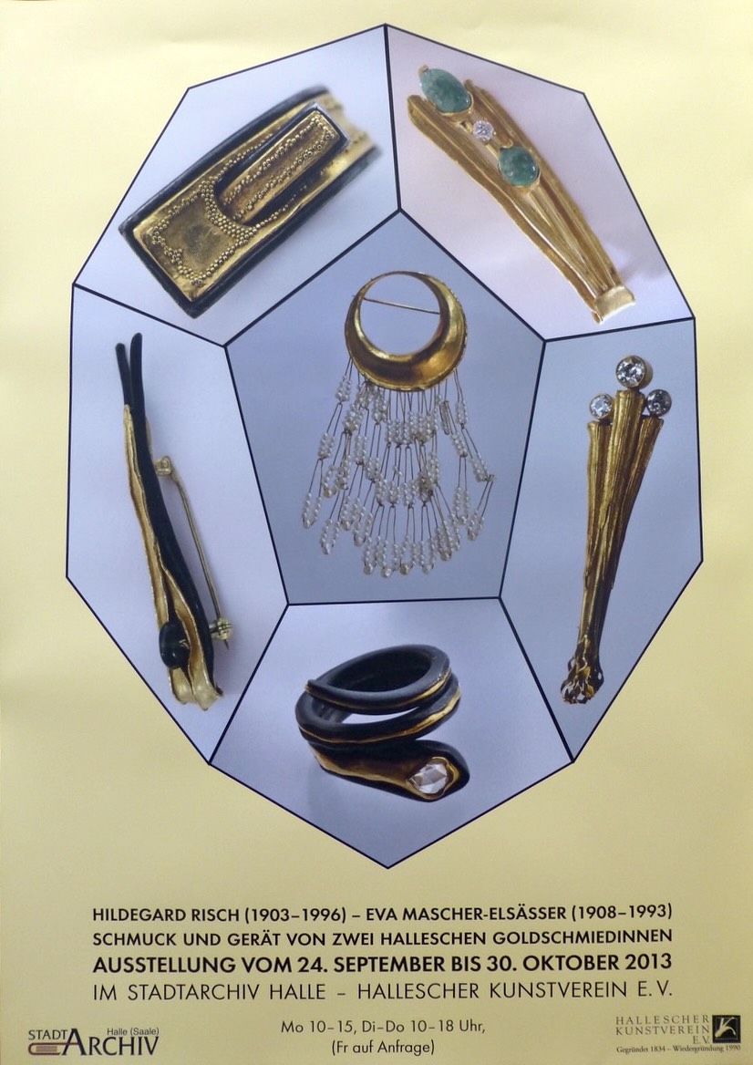 Der Hallesche Kunstverein stellt erstmals in Halle in einer Personalausstellung die beiden Goldschmiedinnen Hildegard Risch (1903-1996) und Eva Mascher-Elsässer (1908-1993) vor, die zu den Pionieren der modernen Schmuckgestaltung in Deutschland gehören. Beide Künstlerinnen haben in Halle an der Kunstgewerbeschule Burg Giebichenstein in der Metallklasse von Karl Müller studiert. Hier lernten sie sich in den 1920er Jahren kennen und schlossen eine künstlerisch sehr befruchtende lebenslange Freundschaft. Sie gehörten zu den Ersten, die die moderne hallesche Schmuckgestaltungstradition auf technisch und formal neuen Wegen entwickelten.