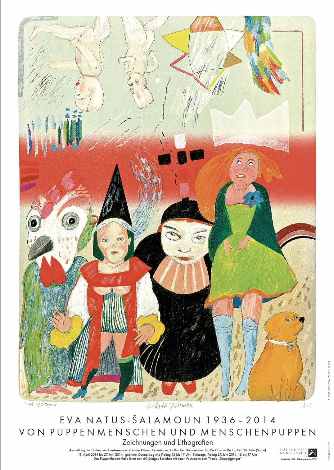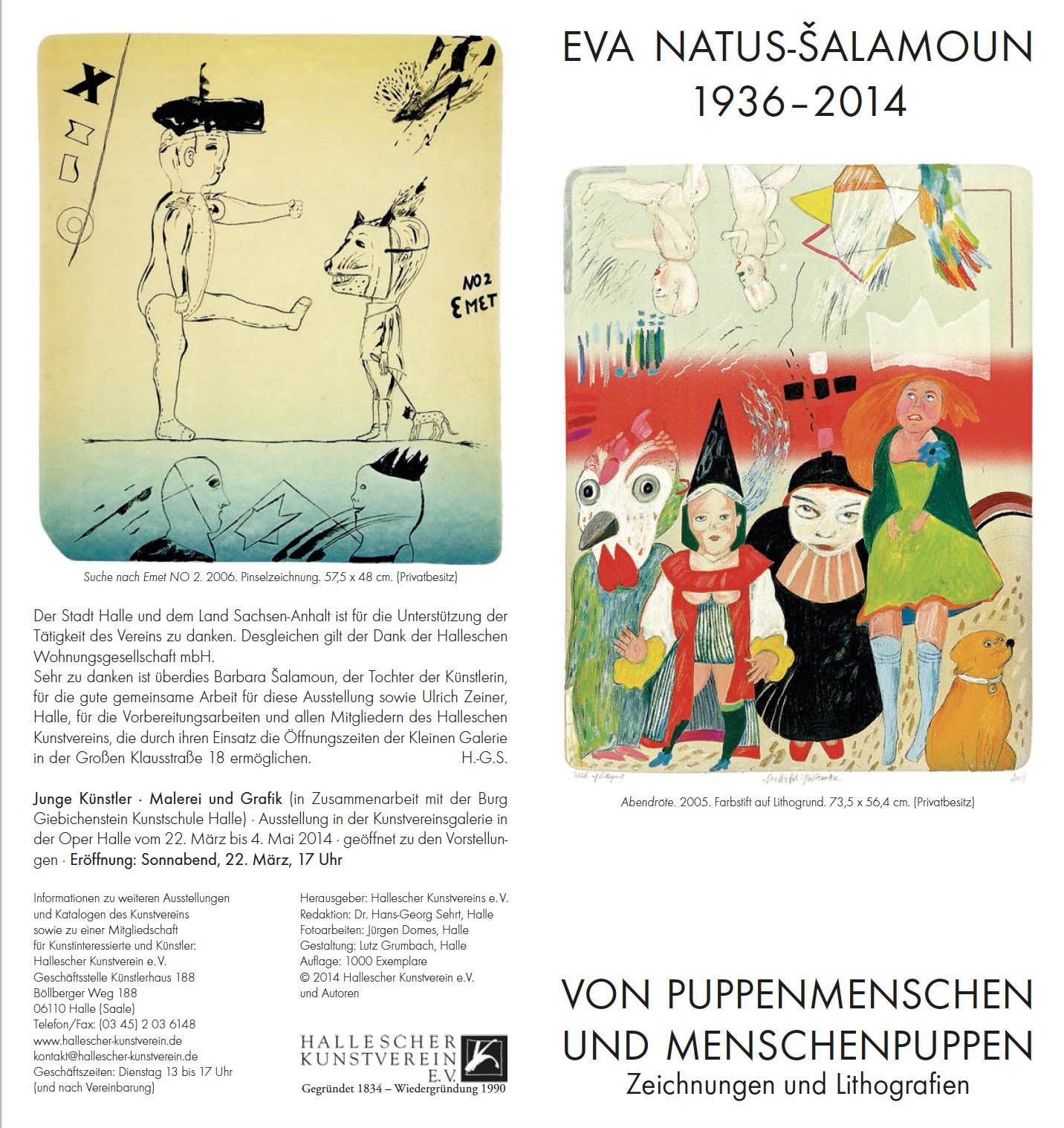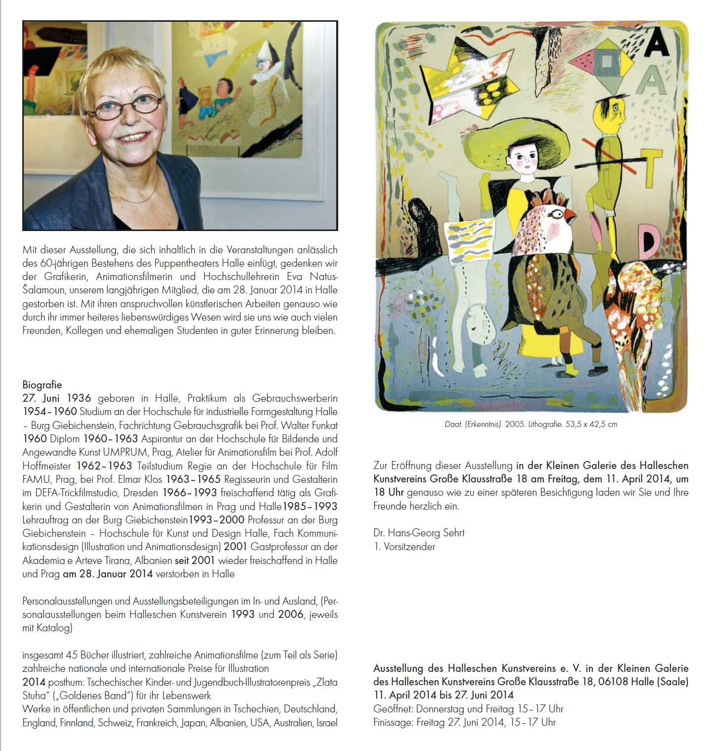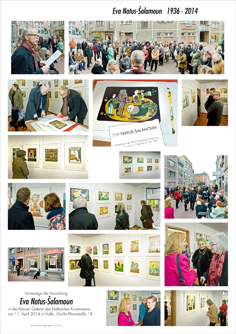 Mit dieser Ausstellung, die sich inhaltlich in die Veranstaltungen anlässlich des 60-jährigen Bestehens des Puppentheaters Halle einfügt, gedenken wir der Grafikerin, Animationsfilmerin und Hochschullehrerin Eva Natus-Šalamoun, unserem langjährigen Mitglied, die am 28. Januar 2014 in Halle gestorben ist.