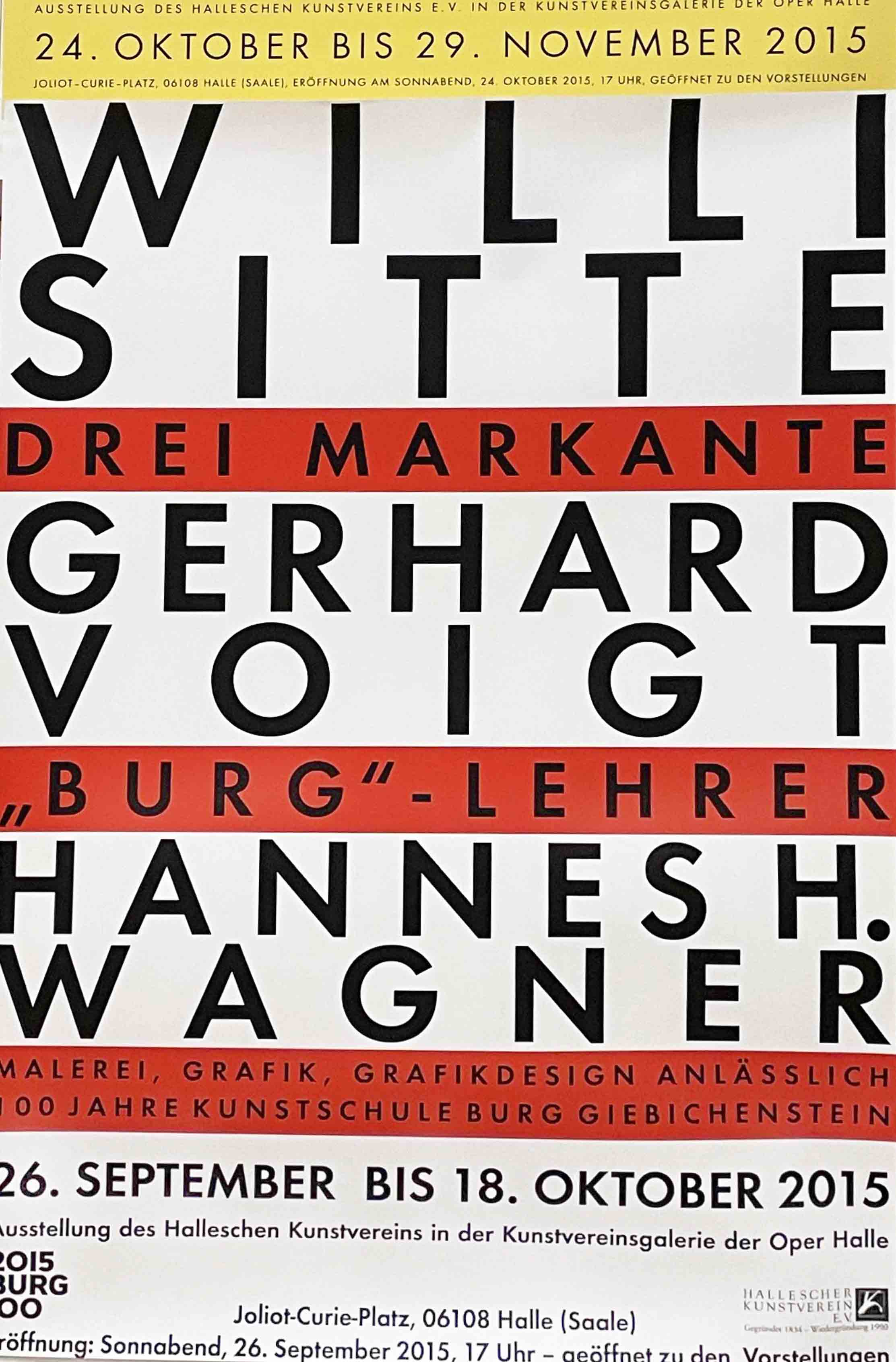 Mit dieser Ausstellung von drei ehemaligen Mitgliedern des Halleschen Kunstvereins – Willi Sitte, Gerhard Voigt und Hannes H. Wagner – setzt der Hallesche Kunstverein seine Würdigung für die Burg Giebichenstein maßgebender Künstlerpersönlichkeiten fort. Alle drei haben in ihren jeweiligen Kunstbereichen vor allem in den 70er und 80er Jahren des 20. Jahrhunderts das Bild der Burg Giebichenstein wesentlich mitbestimmt. Es sind „Drei markante Burg-Lehrer, die aber zugleich für die große Zahl der wichtigen Burglehrer stehen sollen.