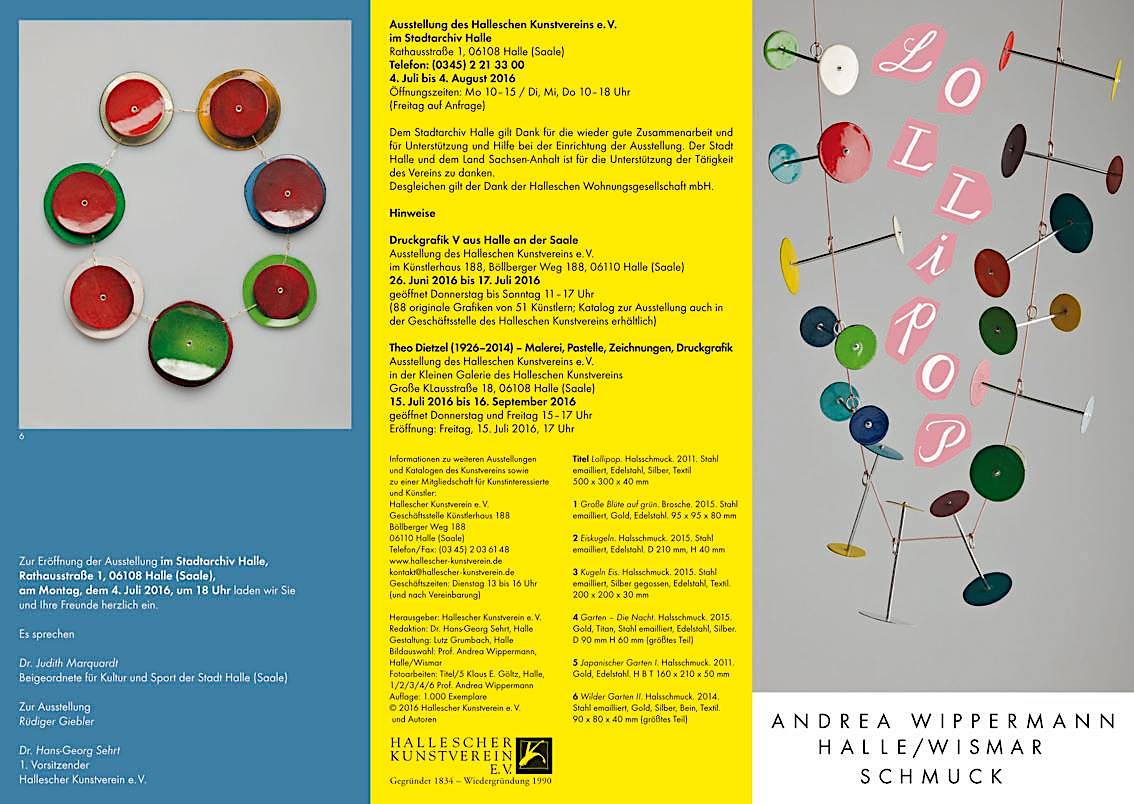 Die neue Ausstellung des Halleschen Kunstvereins im Stadtarchiv Halle ist mit Andrea Wippermann wieder einer renommierten halleschen Schmuckgestalterin gewidmet. Ihre oft spielerischen und fantasievollen Arbeiten reichen vom reinen Schmuck bis zu kleinplastischen Objekten, bei denen sich oft eine enge Beziehung zu Formen des Gartens und der Natur offenbart. Dabei verwendet sie außer den bekannten Edelmetallen mitunter verschiedene andere Materialien, die ihr die Möglichkeit geben, auch verstärkt die Farbe als Gestaltungsmittel einzusetzen.