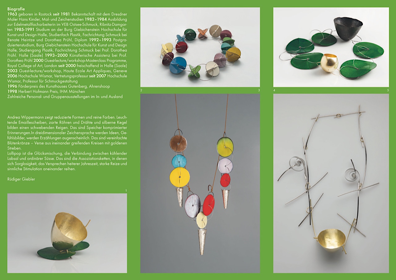 Andrea Wippermann ist seit 2000 freischaffend in Halle tätig und dazu seit 2007 als Professor für Schmuckgestaltung an der Hochschule Wismar. Preise und Auszeichnungen und zahlreiche Personal- und Gruppenausstellungen im In- und Ausland stehen für die Anerkennung der künstlerischen Qualität ihrer Werke.
