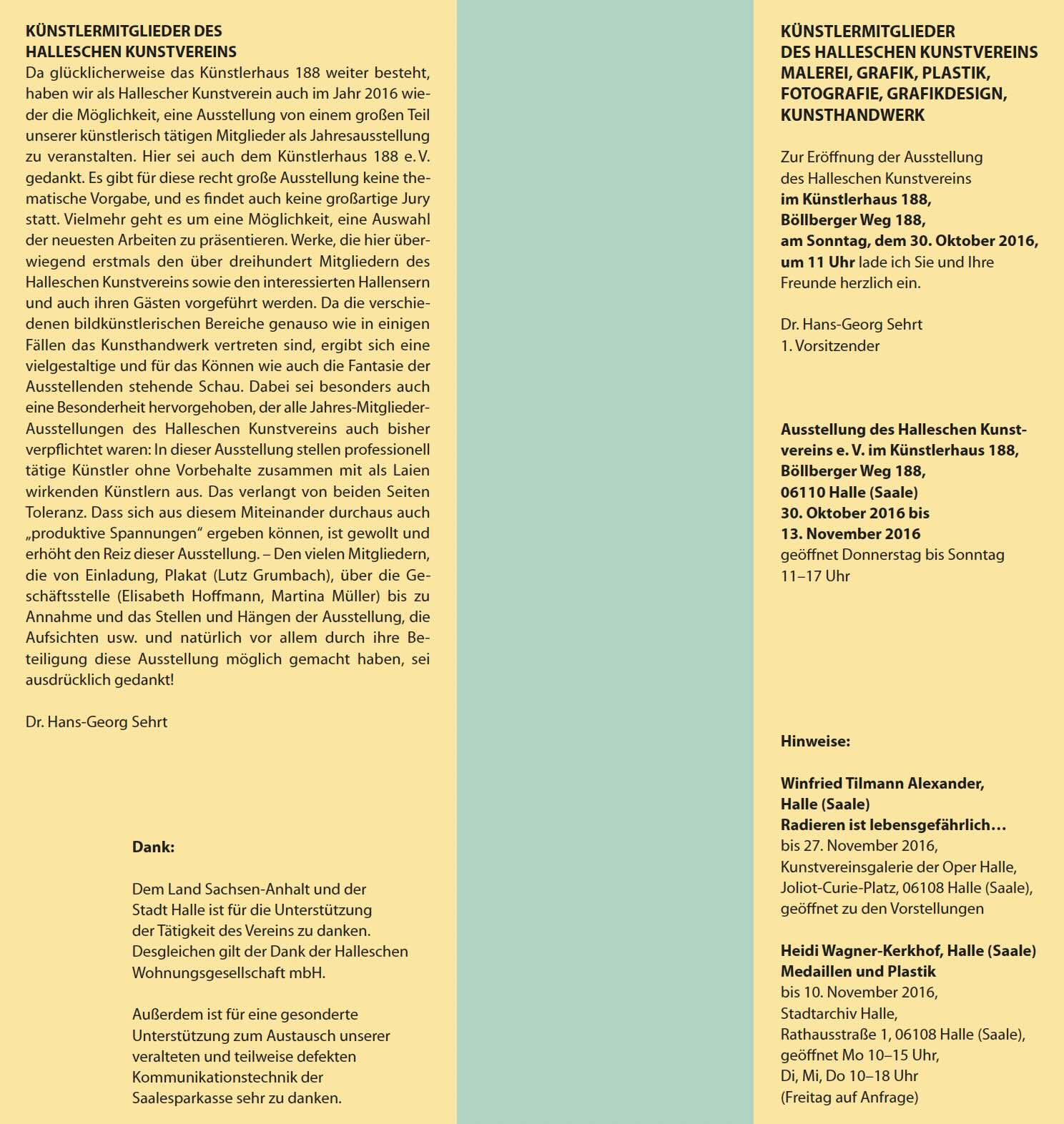 Es gibt für diese recht große Ausstellung keine thematische Vorgabe, und es findet auch keine großartige Jury statt. Vielmehr geht es um eine Möglichkeit, eine Auswahl der neuesten Arbeiten zu präsentieren. Werke, die hier überwiegend erstmals den über dreihundert Mitgliedern des Halleschen Kunstvereins sowie den interessierten Hallensern und auch ihren Gästen vorgeführt werden.