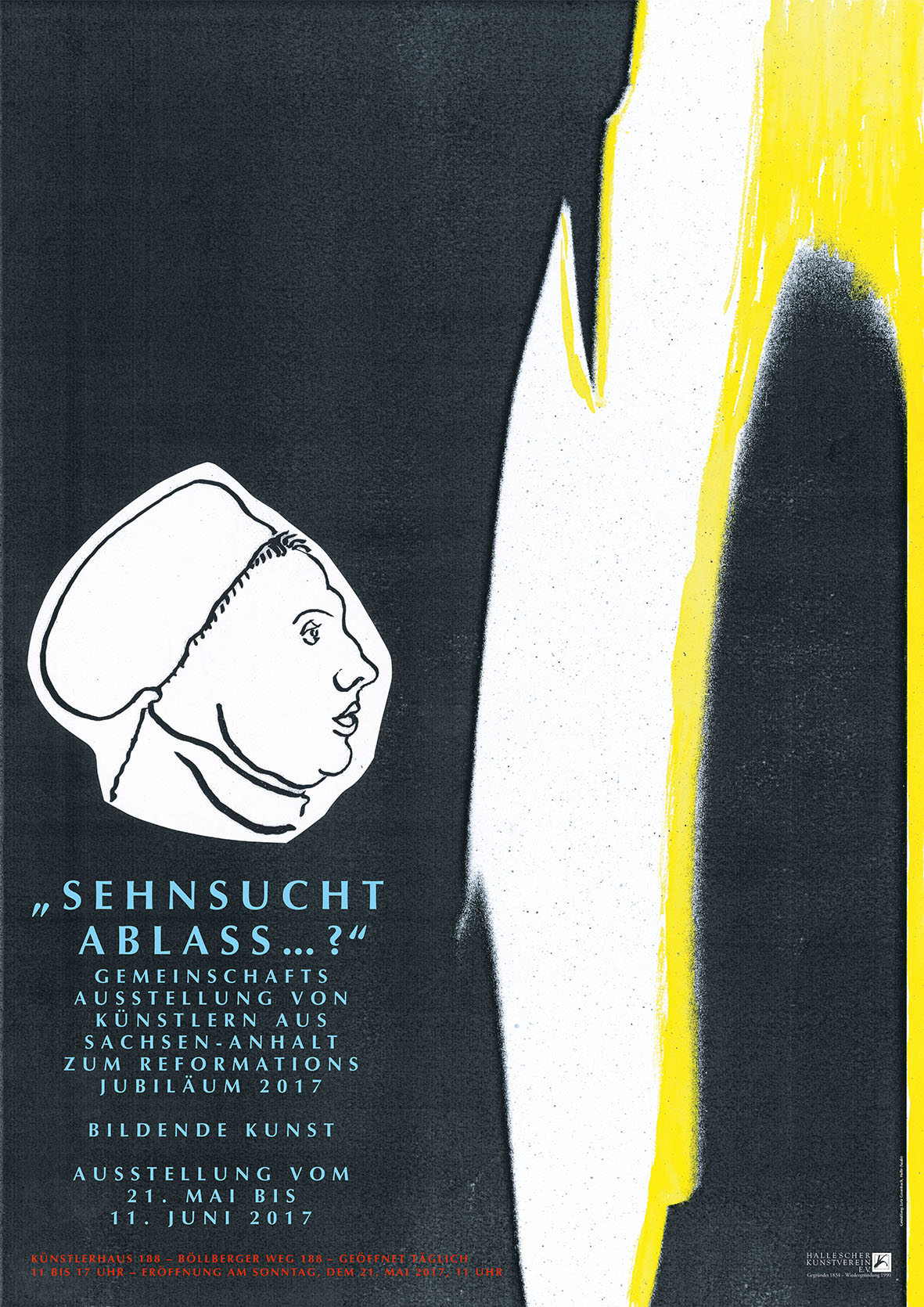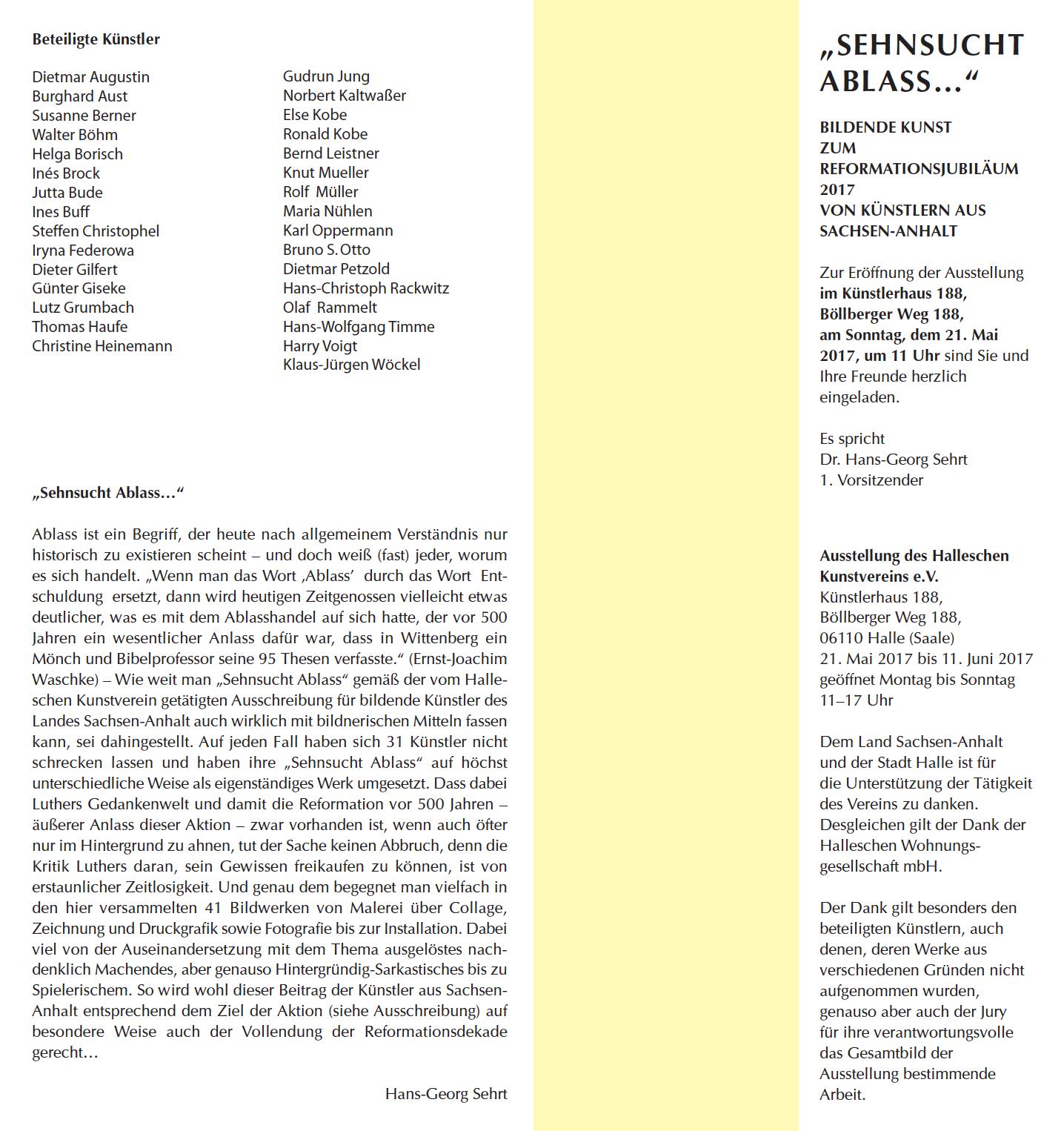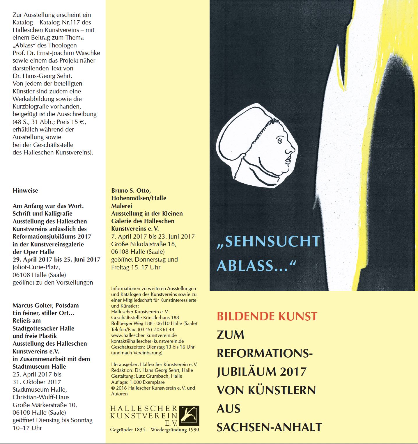 Wie weit man „Sehnsucht Ablass“ gemäß der vom Halleschen Kunstverein getätigten Ausschreibung für bildende Künstler des Landes Sachsen-Anhalt auch wirklich mit bildnerischen Mitteln fassen kann, sei dahingestellt. Auf jeden Fall haben sich 31 Künstler nicht schrecken lassen und haben ihre „Sehnsucht Ablass“ auf höchst unterschiedliche Weise als eigenständiges Werk umgesetzt. Dass dabei Luthers Gedankenwelt und damit die Reformation vor 500 Jahren – äußerer Anlass dieser Aktion – zwar vorhanden ist, wenn auch öfter nur im Hintergrund zu ahnen, tut der Sache keinen Abbruch, denn die Kritik Luthers daran, sein Gewissen freikaufen zu können, ist von erstaunlicher Zeitlosigkeit.