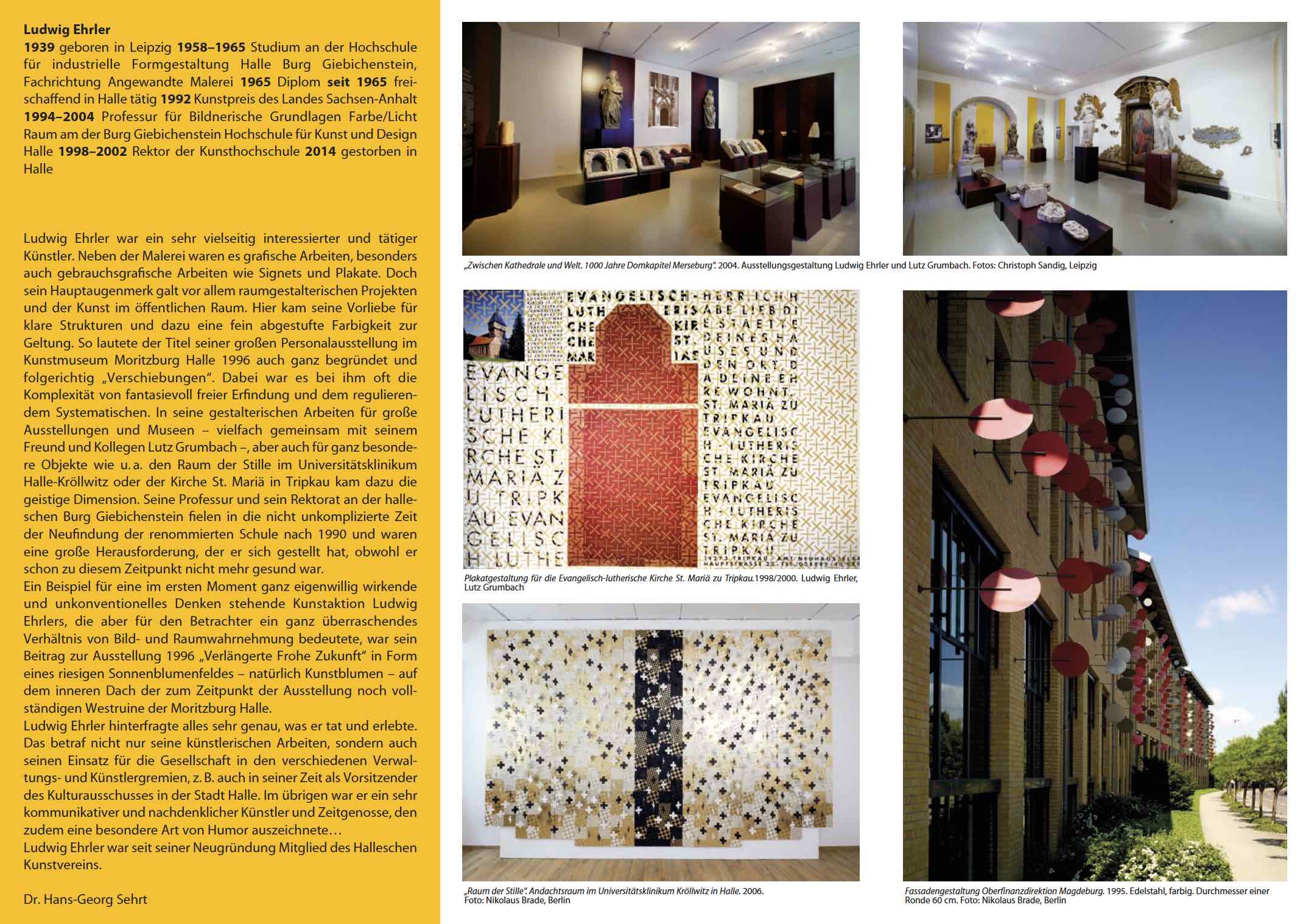 Ludwig Ehrler hinterfragte alles sehr genau, was er tat und erlebte. Das betraf nicht nur seine künstlerischen Arbeiten, sondern auch seinen Einsatz für die Gesellschaft in den verschiedenen Verwaltungs- und Künstlergremien, z. B. auch in seiner Zeit als Vorsitzender des Kulturausschusses in der Stadt Halle. Im Übrigen war er ein sehr kommunikativer und nachdenklicher Künstler und Zeitgenosse, den zudem eine besondere Art von Humor auszeichnete …