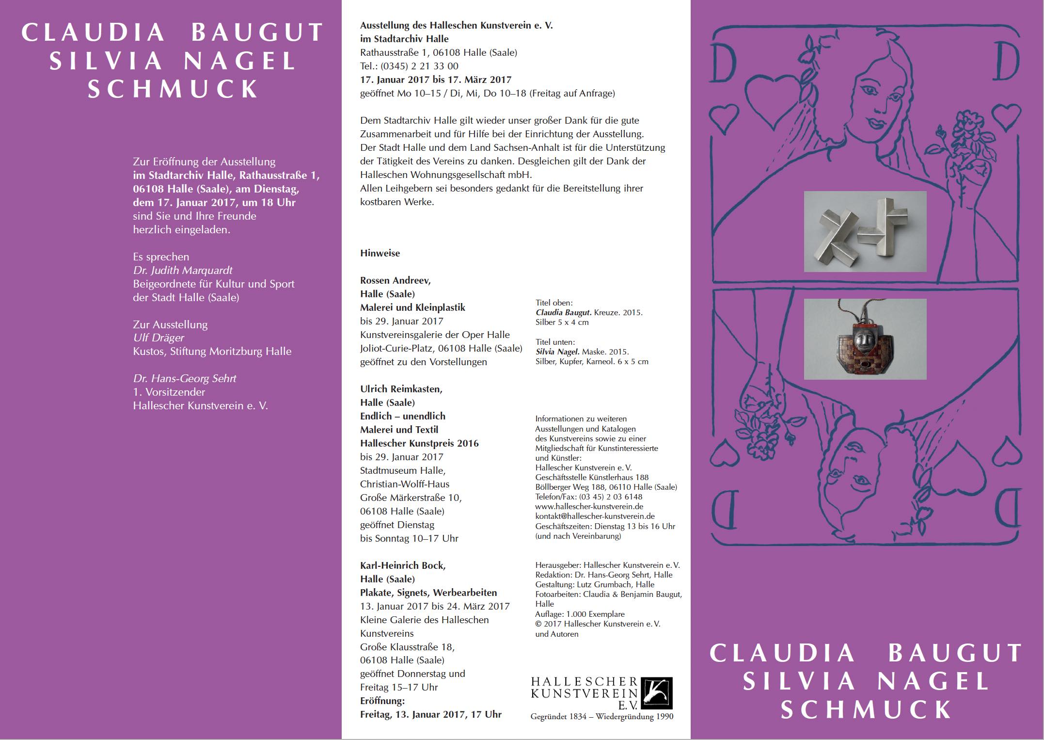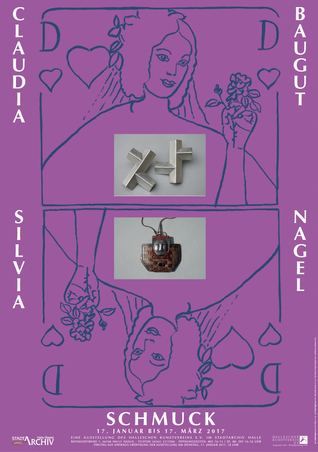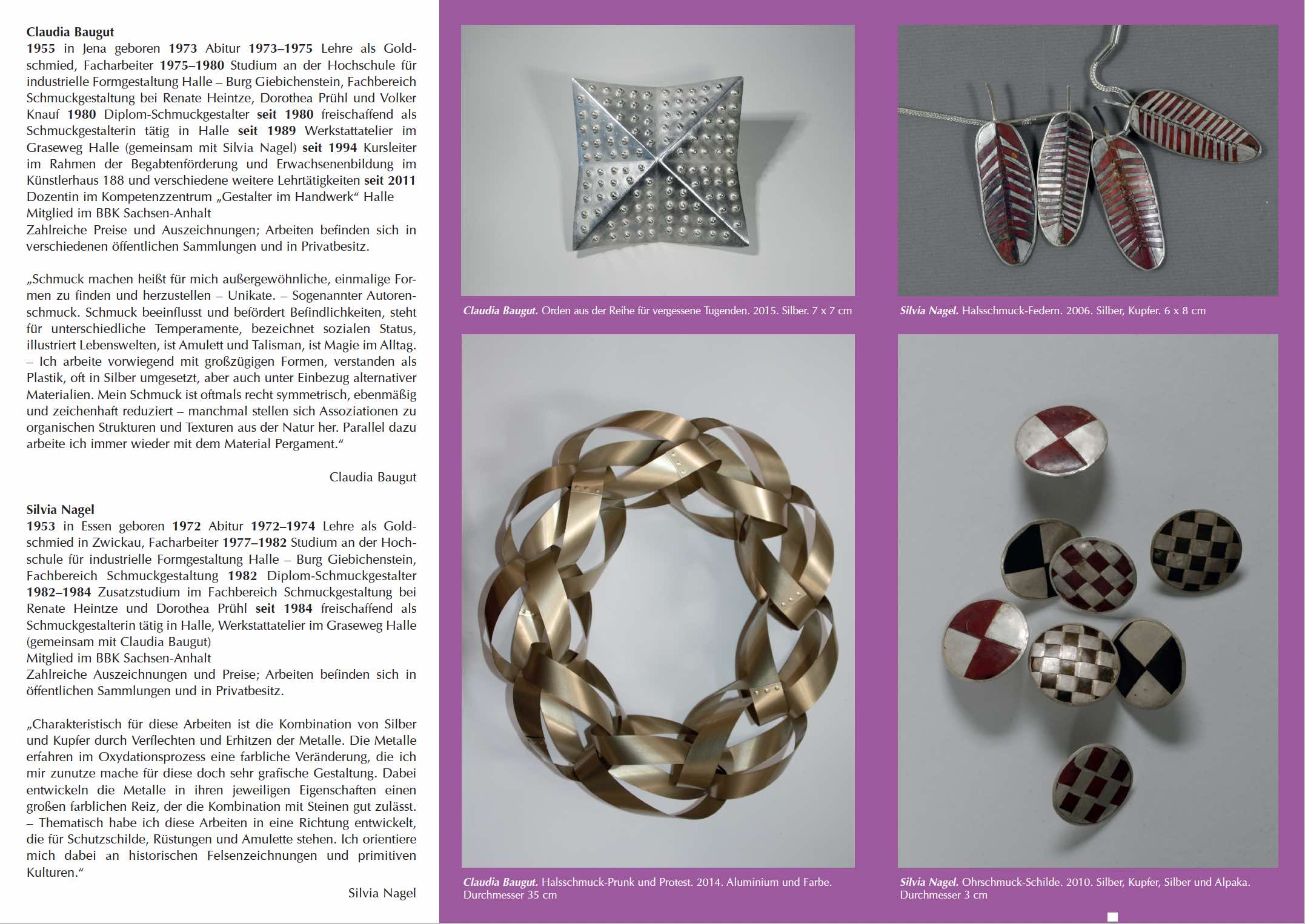Mit den beiden Künstlerinnen Claudia Baugut und Silvia Nagel setzt der Hallesche Kunstverein seine Ausstellungen mit zeitgenössischem Schmuck fort. Beide sind Absolventen der Burg Giebichenstein – Claudia Baugut Diplom 1980, Silvia Nagel Diplom 1982 - und seit vielen Jahren freischaffend in ihrem Beruf in Halle tätig und haben gegenwärtig ihr gemeinsames Werkstattatelier im Graseweg. Die für sie maßgebenden Lehrer an der „Burg“ waren Renate Heintze und Dorothea Prühl.