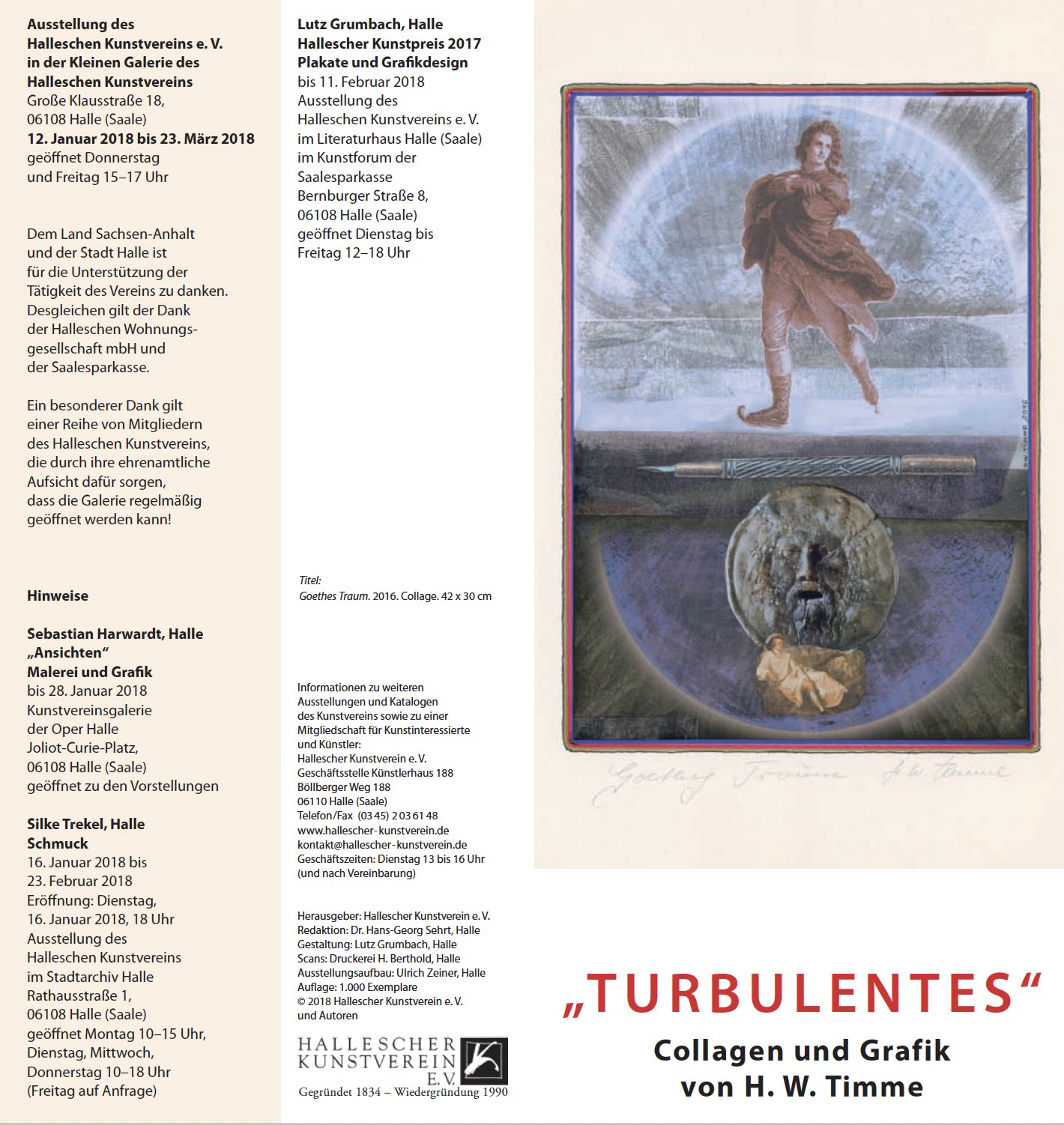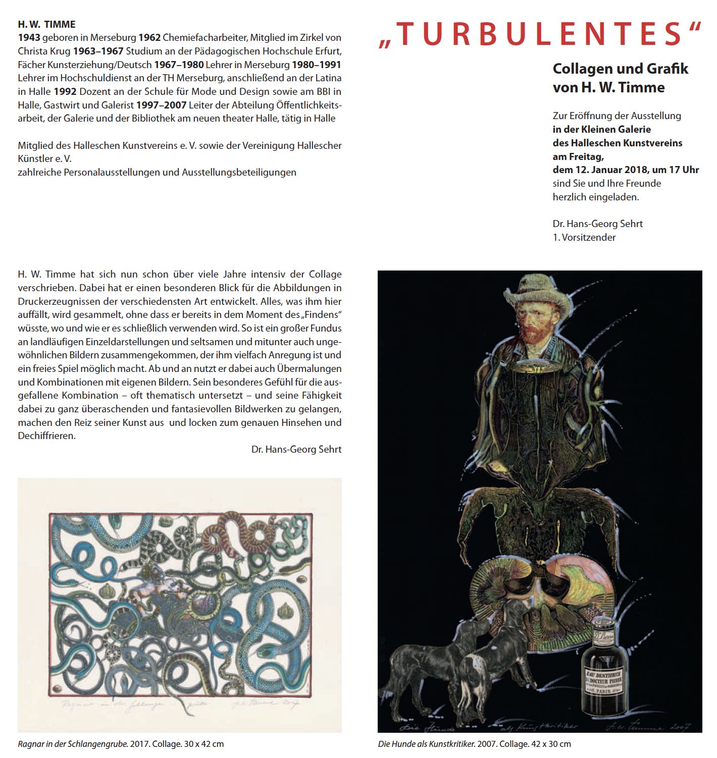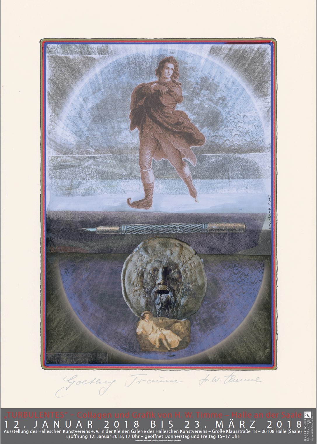 In der ersten Ausstellung des Halleschen Kunstvereins im Jahr 2018 wird von dem halleschen Künstler Wolfgang Timme eine Auswahl seiner Collagen gezeigt. Mit seiner Spezialisierung darauf in den vergangenen Jahren hat er sich eine künstlerische Technik erschlossen, mit der er sehr überraschende und ungewöhnliche Arbeiten zustande bringt. Dabei spürt man in all seinen Werken seine Fähigkeit zu guter Komposition und wirkungsvoller Gestaltung. Bei dem Umgang mit vorhandenen Bildern aus Zeitschriften, Zeitungen, Werbeschriften und Katalogen, die er oft in mitunter fast surreale Verbindungen bringt, ergeben sich für den Betrachter der überwiegend kleinerformatigen so entstandenen neuen Bilder vielfältige gedankliche Verbindungen und ein bereicherndes fantasievolles Spiel mit Vorhandenem und Erdachtem.