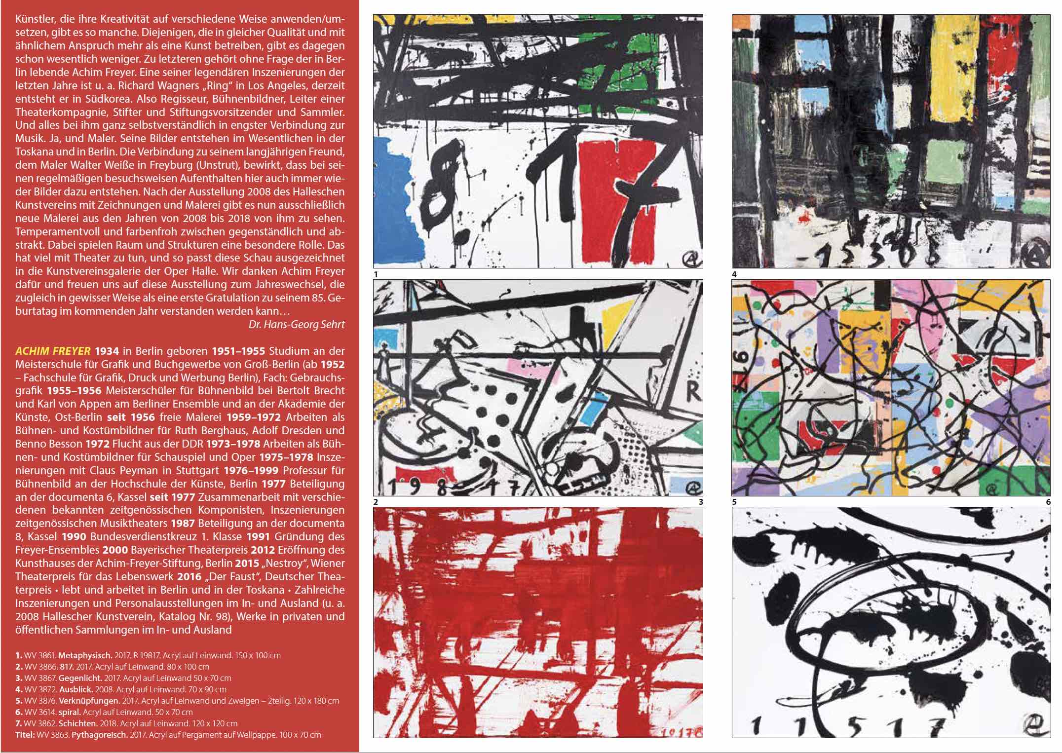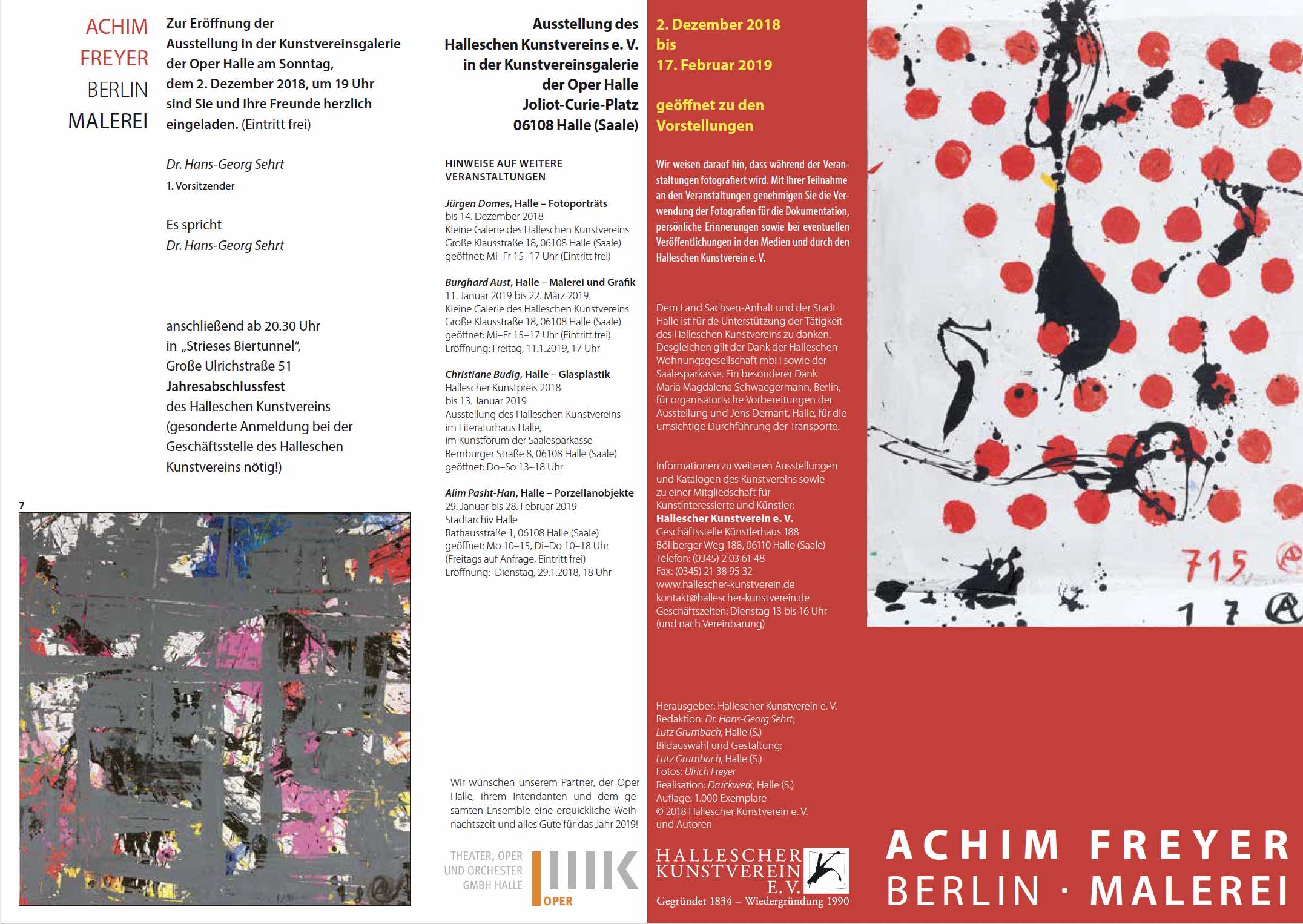 Temperamentvoll und farbenfroh zwischen gegenständlich und abstrakt. Dabei spielen Raum und Strukturen eine besondere Rolle. Das hat viel mit Theater zu tun, und so passt diese Schau ausgezeichnet in die Kunstvereinsgalerie der Oper Halle. Wir danken Achim Freyer dafür und freuen uns auf diese Ausstellung zum Jahreswechsel, die zugleich in gewisser Weise als eine erste Gratulation zu seinem 85. Geburtstag im kommenden Jahr verstanden werden kann ...