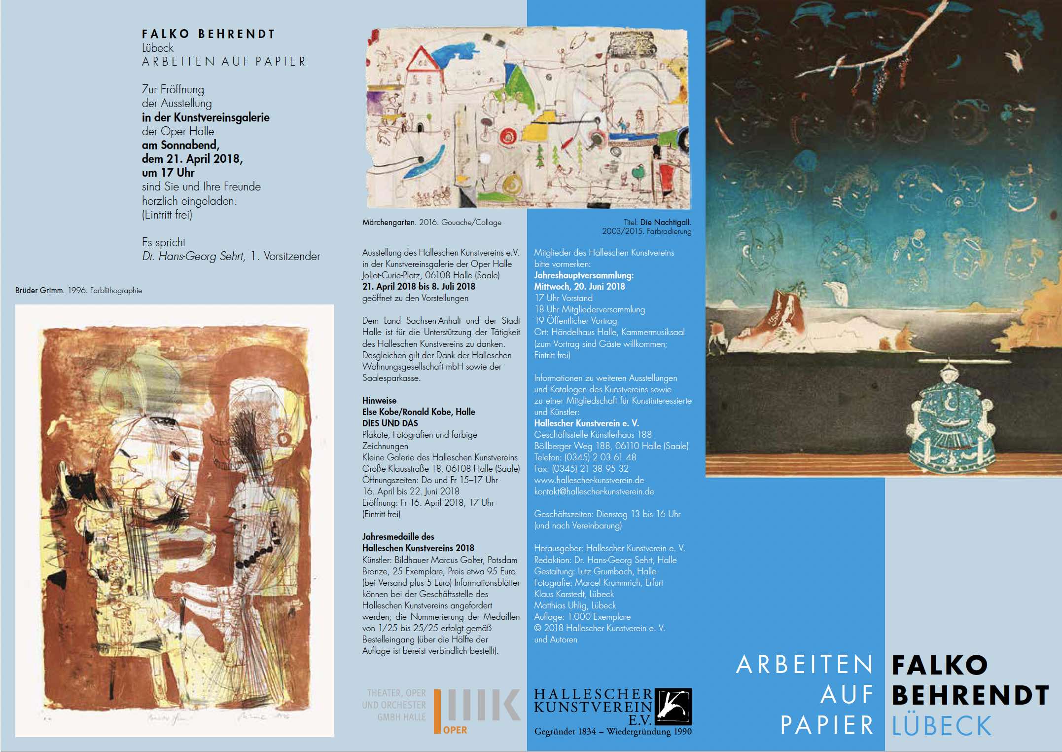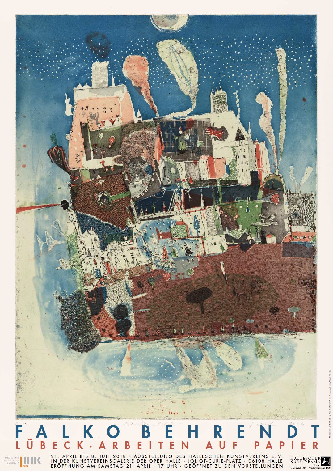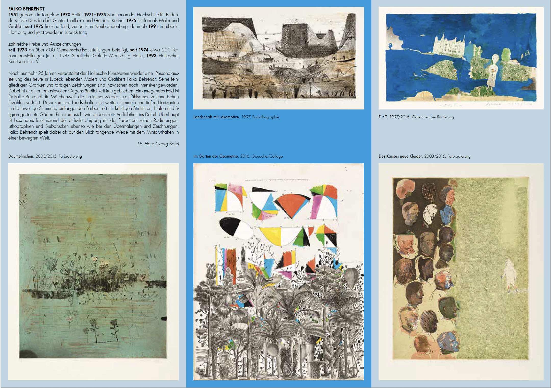 Nach nunmehr 25 Jahren veranstaltet der Hallesche Kunstverein wieder eine Personalausstellung des heute in Lübeck lebenden Malers und Grafikers Falko Behrendt. Seine feingliedrigen Grafiken und farbigen Zeichnungen sind inzwischen noch intensiver geworden. Dabei ist er einer fantasievollen Gegenständlichkeit treu geblieben. Ein anregendes Feld ist für Falko Behrendt die Märchenwelt, die ihn immer wieder zu einfühlsamen zeichnerischen Erzählen verführt. Dazu kommen Landschaften mit weiten Himmeln und tiefen Horizonten in die jeweilige Stimmung einfangenden Farben, oft mit kritzligen Strukturen, Häfen und filigran gestaltete Gärten. Panoramasicht wie andererseits Verliebtheit ins Detail. Überhaupt ist besonders faszinierend der diffizile Umgang mit der Farbe bei seinen Radierungen, Lithographien und Siebdrucken ebenso wie bei den Übermalungen und Zeichnungen. Falko Behrendt spielt dabei oft auf den Blick fangende Weise mit dem Miniaturhaften in einer bewegten Welt.