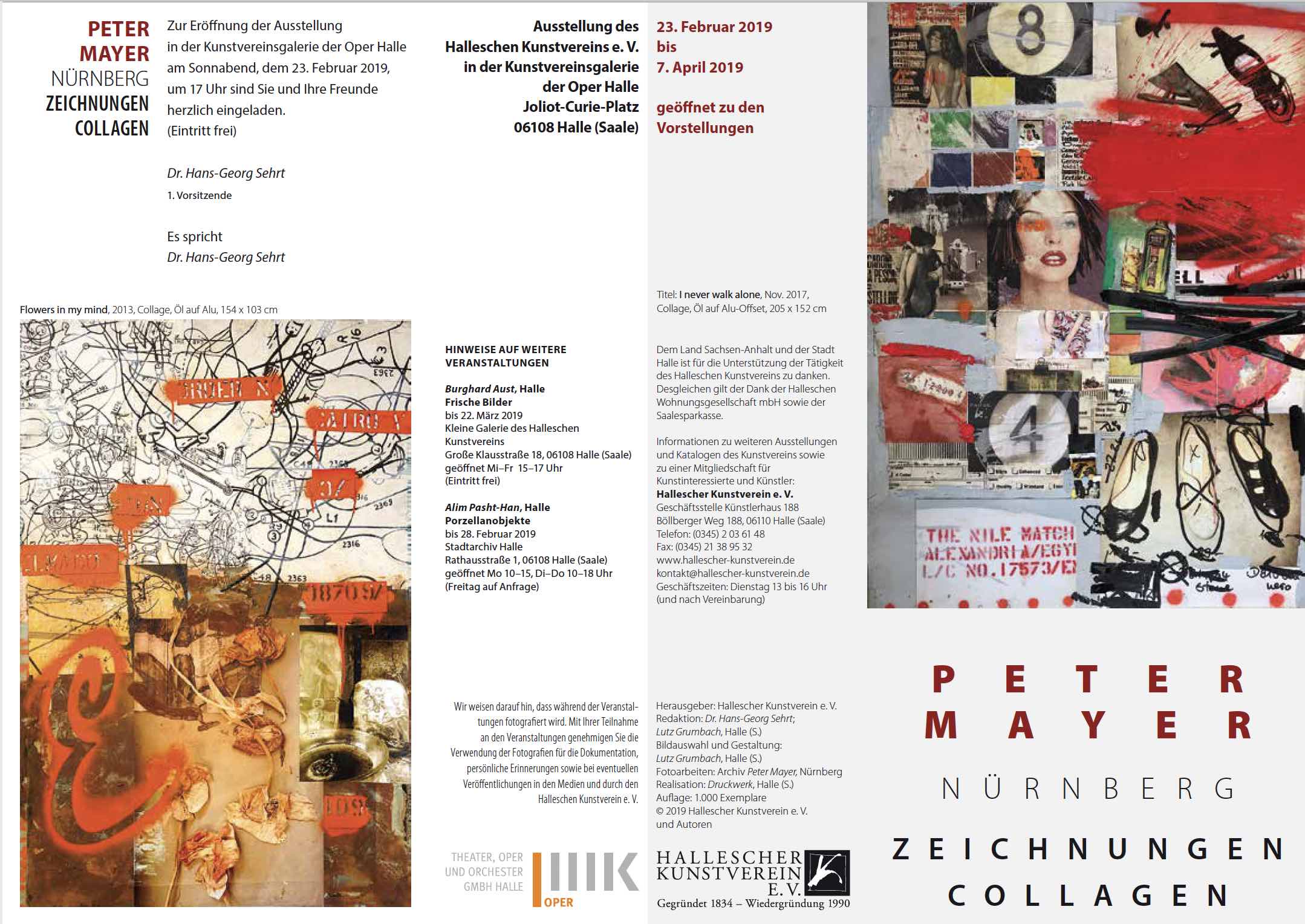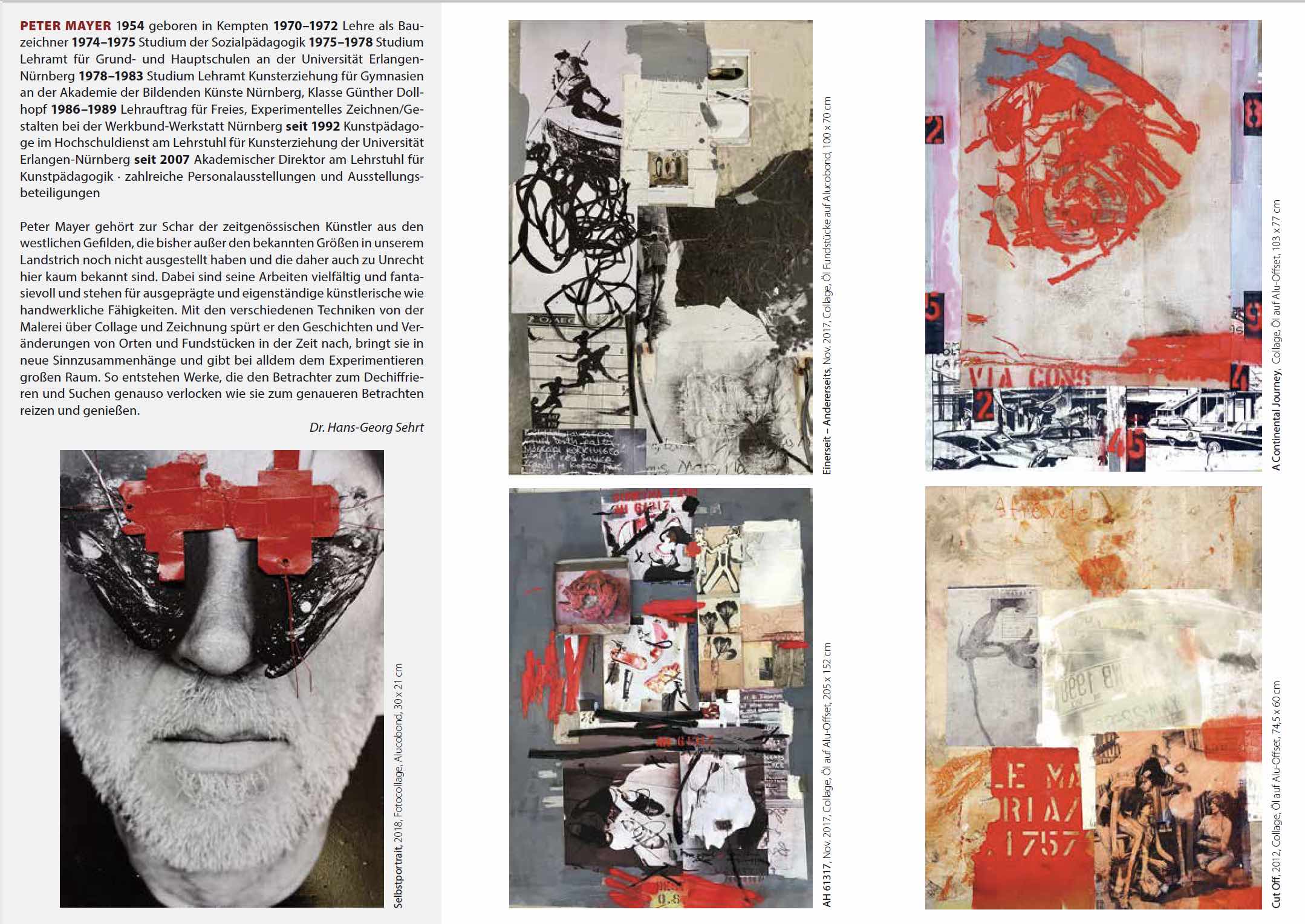 Peter Mayer gehört zur Schar der zeitgenössischen Künstler aus den westlichen Gefilden, die bisher außer den bekannten Größen in unserem Landstrich noch nicht ausgestellt haben und die daher auch zu Unrecht hier kaum bekannt sind. Dabei sind seine Arbeiten vielfältig und fantasievoll und stehen für ausgeprägte und eigenständige künstlerische wie handwerkliche Fähigkeiten. Mit den verschiedenen Techniken von der Malerei über Collage und Zeichnung spürt er den Geschichten und Veränderungen von Orten und Fundstücken in der Zeit nach, bringt sie in neue Sinnzusammenhänge und gibt bei alldem dem Experimentieren großen Raum.