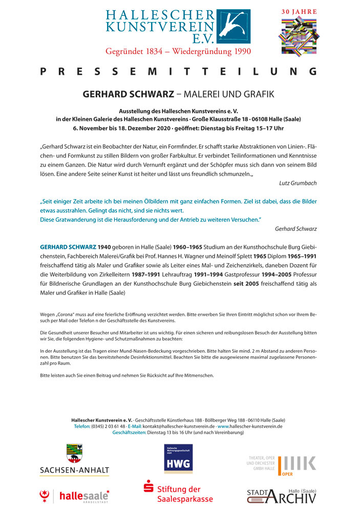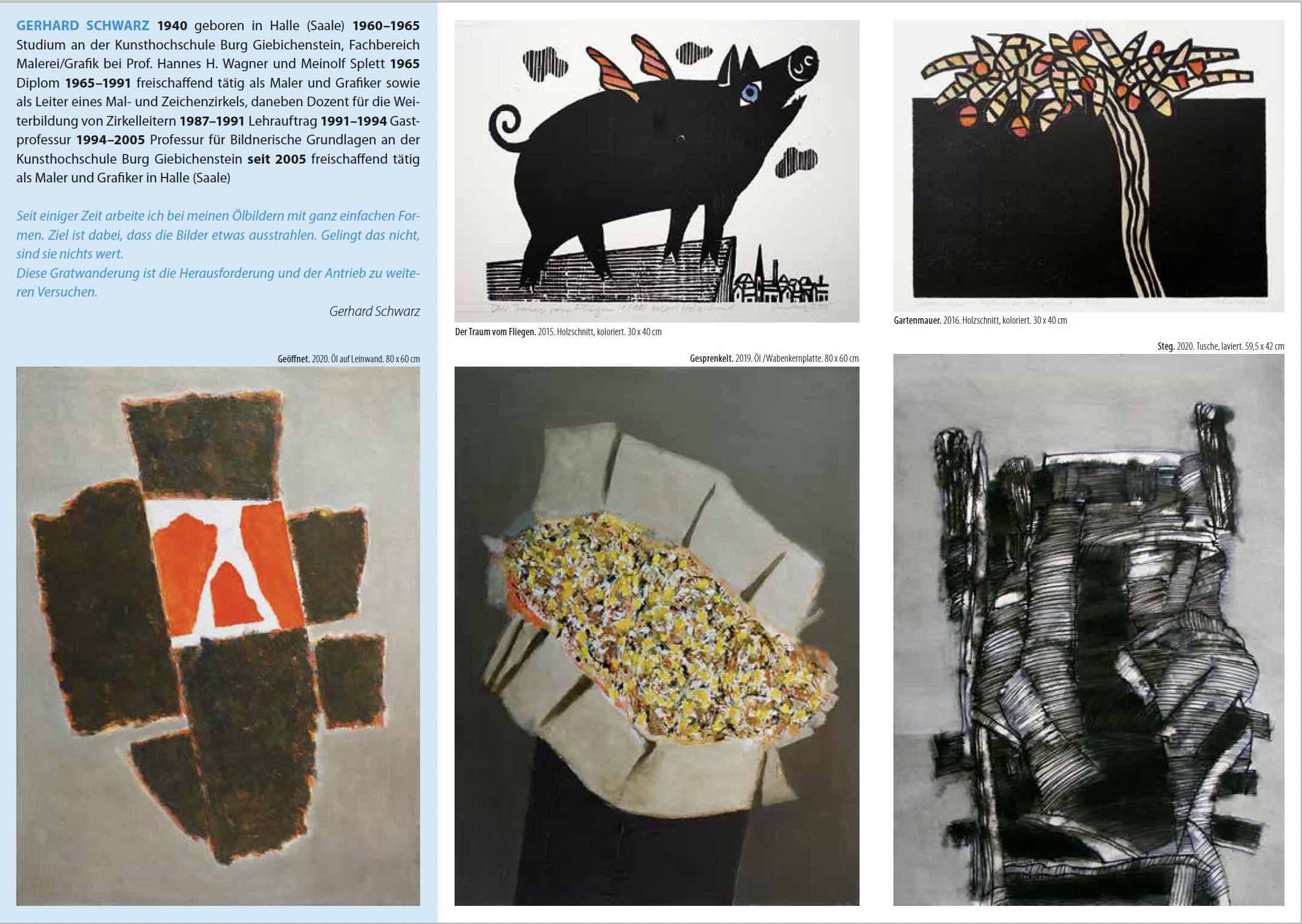 Gerhard Schwarz ist ein Beobachter der Natur, ein Formfinder. Er schafft starke Abstraktionen von Linien-. Flächen- und Formkunst zu stillen Bildern von großer Farbkultur. Er verbindet Teilinformationen und Kenntnisse zu einem Ganzen. Die Natur wird durch Vernunft ergänzt und der Schöpfer muss sich dann von seinem Bild lösen, Eine andere Seite seiner Kunst ist heiter und lässt uns freundlich schmunzeln.