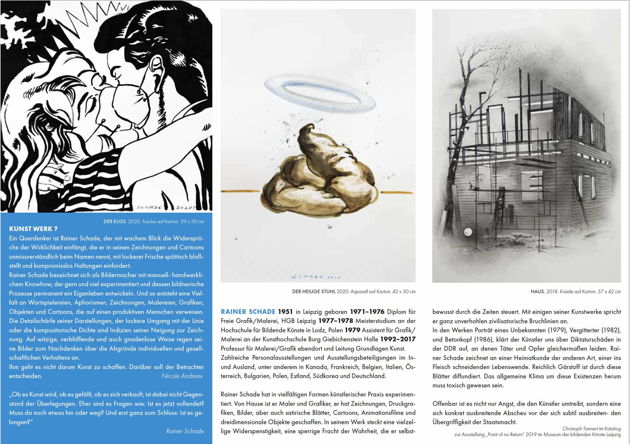 Ein Querdenker ist Rainer Schade, der mit wachem Blick die Widersprüche der Wirklichkeit einfängt, die er in seinen Zeichnungen und Cartoons unmissverständlich beim Namen nennt, mit lockerer Frische spöttisch bloßstellt und kompromisslos Haltungen einfordert.