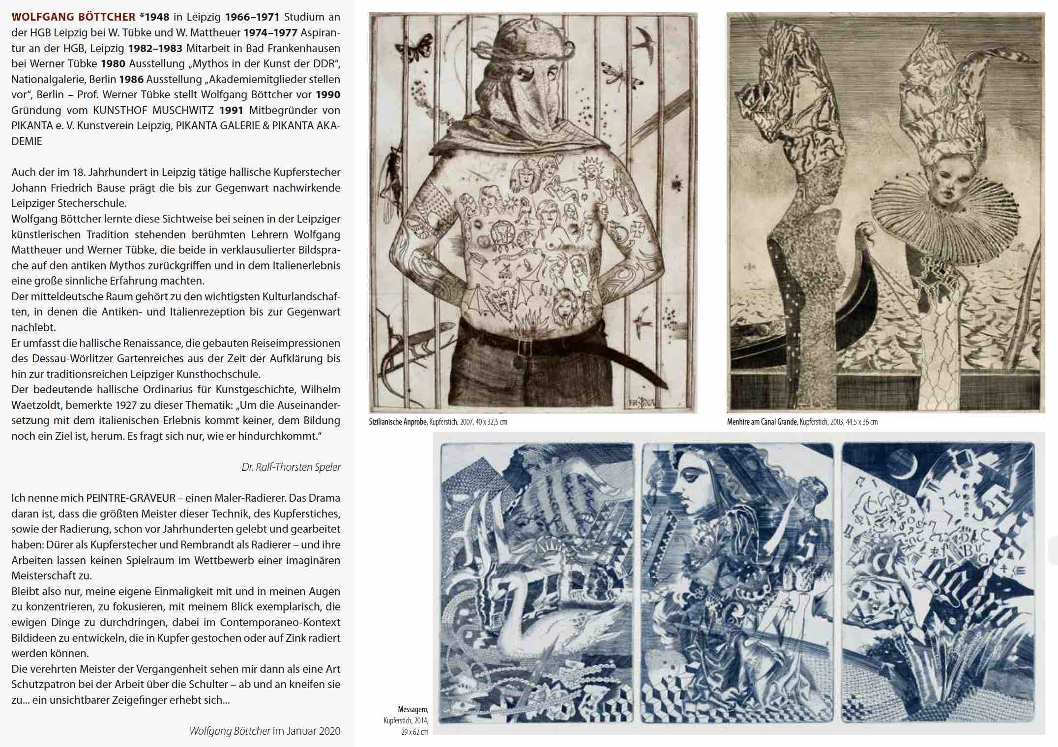 Auch der im 18. Jahrhundert in Leipzig tätige hallische Kupferstecher Johann Friedrich Bause prägt die bis zur Gegenwart nachwirkende Leipziger Stecherschule. Wolfgang Böttcher lernte diese Sichtweise bei seinen in der Leipziger künstlerischen Tradition stehenden berühmten Lehrern Wolfgang Mattheuer und Werner Tübke, die beide in verklausulierter Bildsprache auf den antiken Mythos zurückgriffen und in dem Italienerlebnis eine große sinnliche Erfahrung machten.