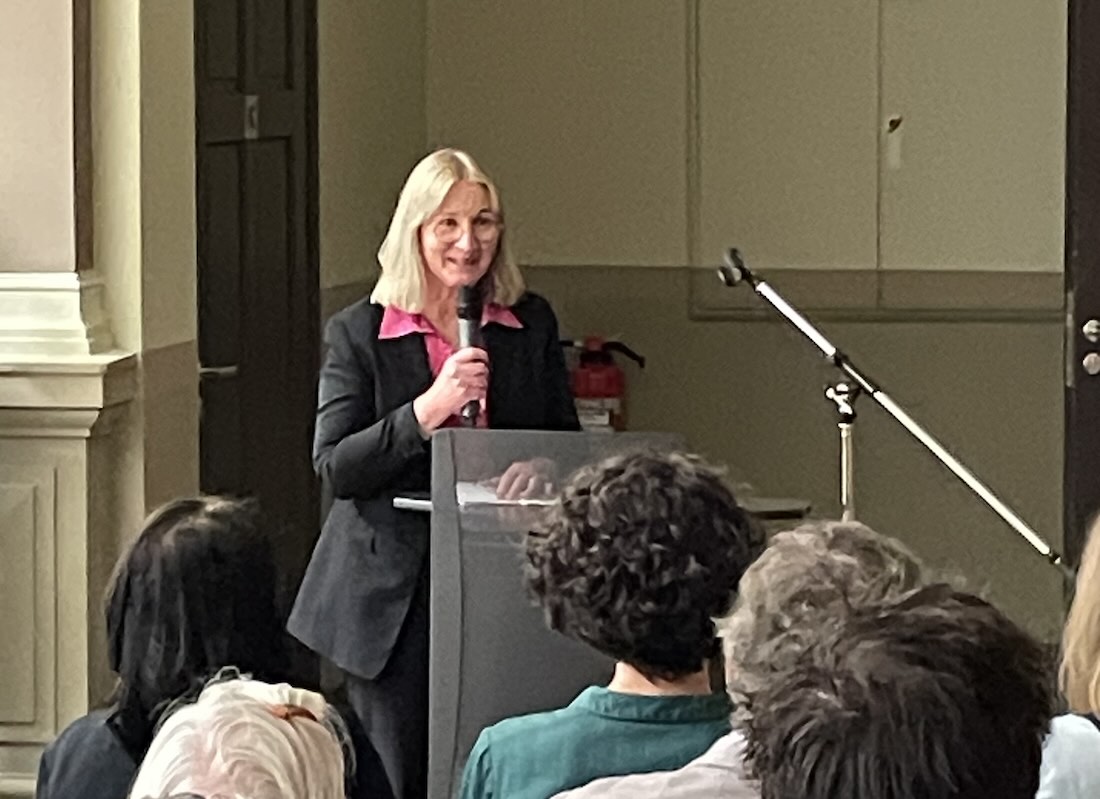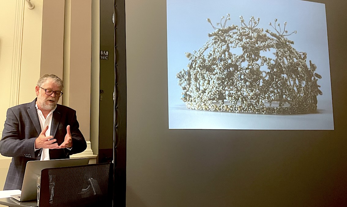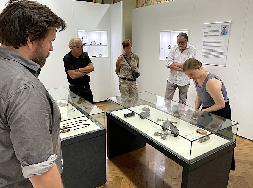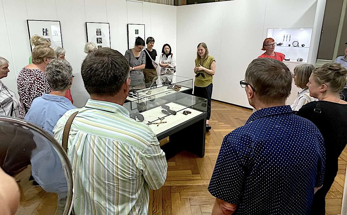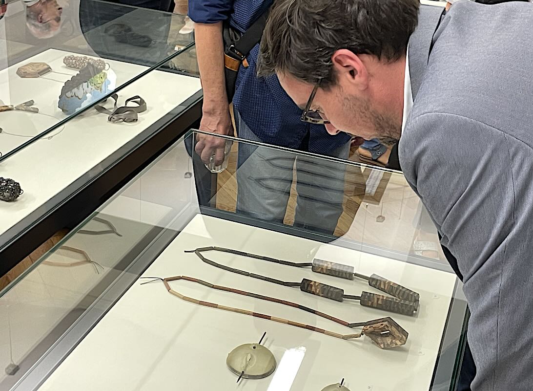 Im Rahmen der Ausstellung führte Ulf Dräger, Vorstandsmitglied beim Kunstverein und Kustos des Kunstmuseums Moritzburg, unterhaltsam und kenntnisreich durch die Geschichte der halleschen Schmuckkunst, angefangen von der berühmten Perlhaube bis zu den Arbeiten aktueller Schmuckkünstlerinnen und Schmuckkünstler. - Fotos: Waterstraat
