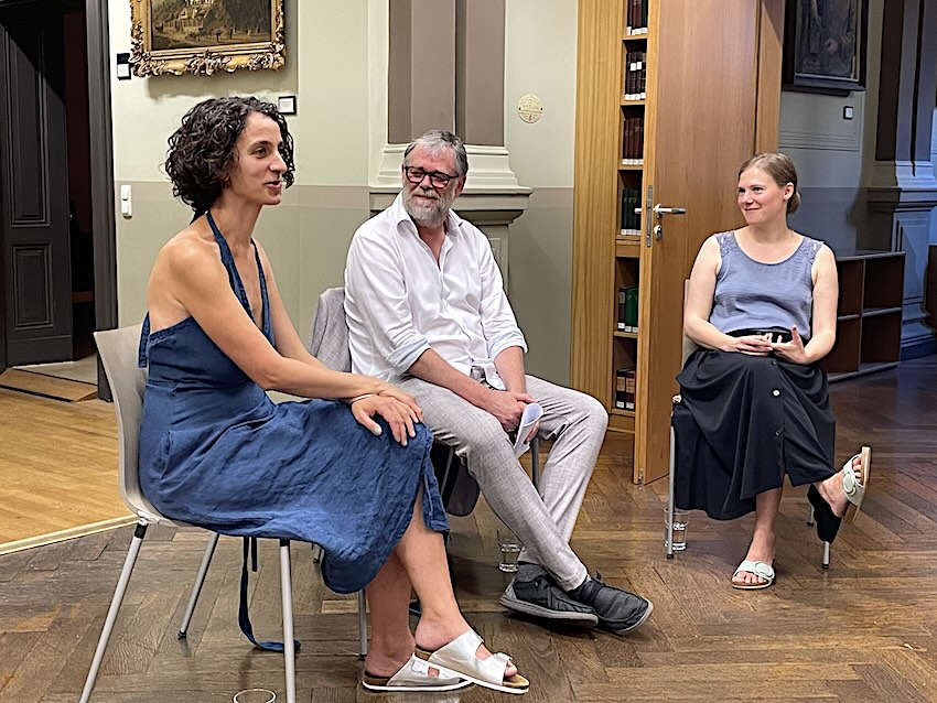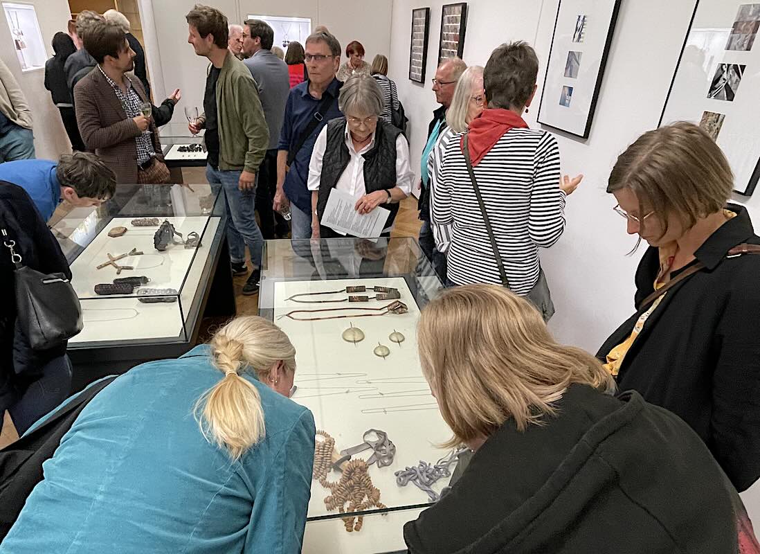 Trotz eines heißen Sommertages fanden etliche Schmuckliebhaber den Weg zum Stadtarchiv, wo die Ausstellung "Zwei an einem Ort" zunächst mit einem Künstlergespräch beendet wurde. Elisa Sophia Herrmann und Sarah Schuschkleb standen Vorstandsmitglied Ulf Dräger Rede und Antwort und gaben Einblick in ihren jeweiligen Schaffensprozess.