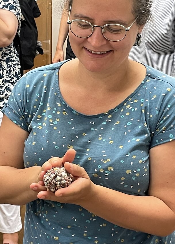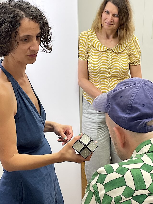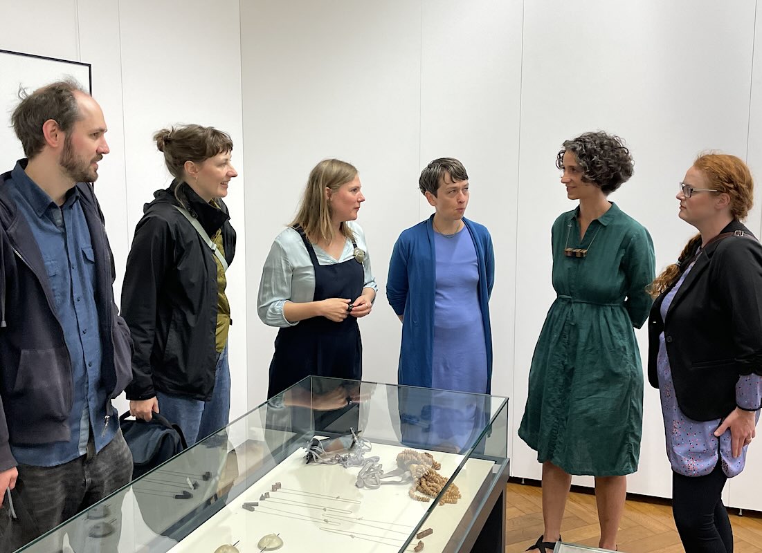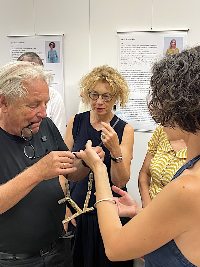 Im Anschluss wurden die Vitrinen geöffnet und die Schmuckkünstlerinnen ermöglichten es den Gästen der Finissage, den Schmuck in die Hand zu nehmen und auch selbst anzulegen. Dazu erläuterten sie Materialien, Gestaltungsideen und Fertigungstechniken. Es war eine wunderbere Möglichkeit, modernen künstlerischen Schmuck aus Halle kennenzulernen.