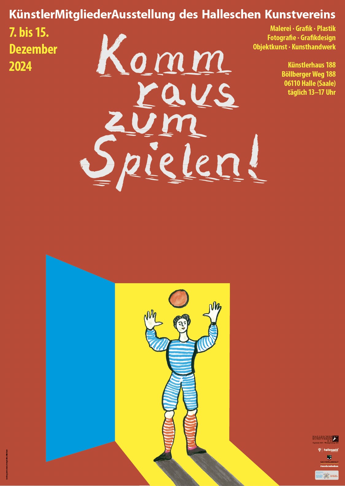 Der Hallesche Kunstverein führt auch in diesem Jahr seine Tradition fort, im Rahmen einer Künstler-Mitglieder-Ausstellung Arbeiten von professionellen und Laienkünstlers aus dem Kunstverein nebeneinander zu zeigen. Das Motto lautet "Komm raus zum Spielen. Er knüpft am Motto des diesjährigen Themenjahres der Stadt Halle an. Zu sehen sind etwa 50 Arbeiten aus den Bereichen Malerei, Zeichnung und Grafik, Fotografie, Objektkunst und Kunsthandwerk/Keramik. Bei Interesse können die Arbeiten käuflich erworben werden.
