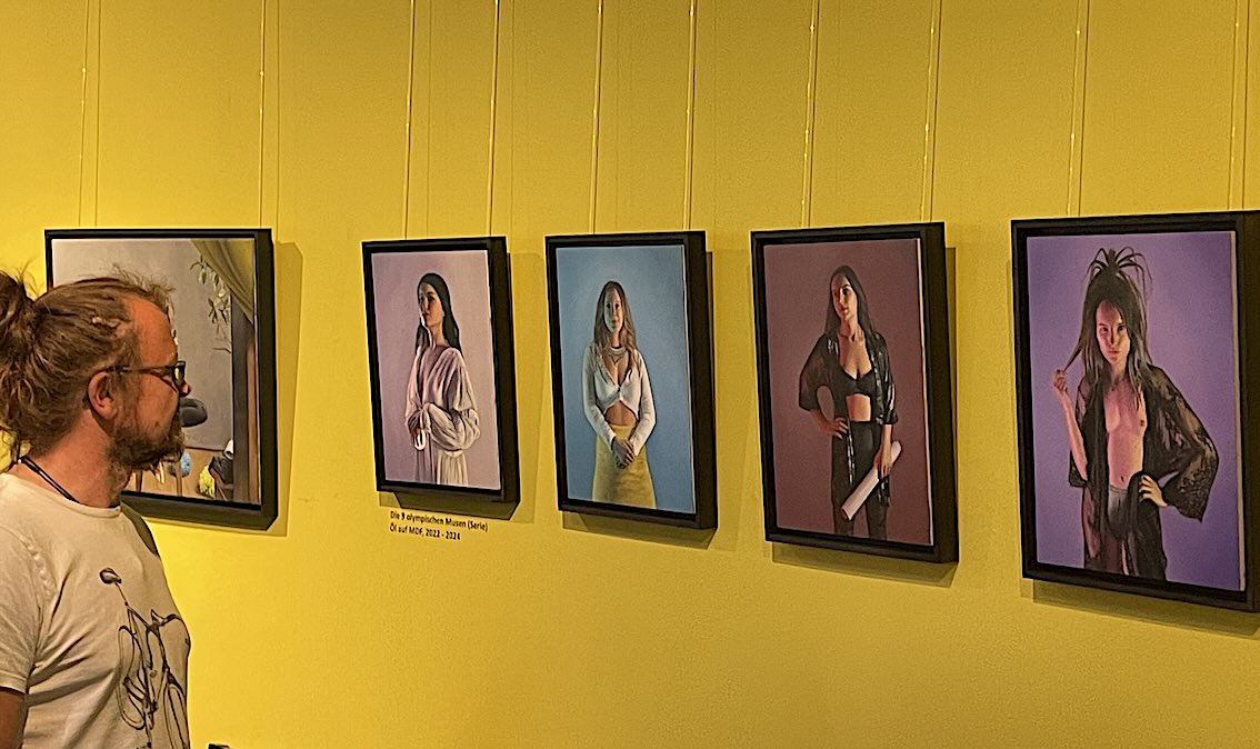 Ein zentrales Werkensemble der Ausstellung ist den neun Musen gewidmet – jenem mythischen Ursprung weiblicher Inspiration. Friedrichs Bilder tragen ihre Namen: Urania, Melpomene, Kalliope, Thalia, Clio, Polyhymnia, Erato, Terpsichore, Euterpe. Doch es sind keine antiken Allegorien, die er malt. Es sind reale Modelle, die in die Rolle der Muse treten, sie mit Gegenwart füllen und Ambivalenz zulassen. Ihre Präsenz basiert nicht auf Idealisierung und Illusion, sondern auf Inszenierung – und verweist damit auf Friedrichs zentrales Thema: das Spannungsverhältnis zwischen Darstellung und Selbstbild, zwischen Pose und Persönlichkeit.