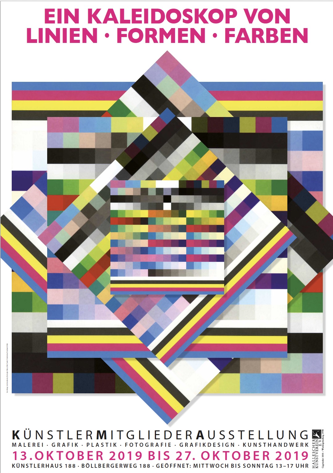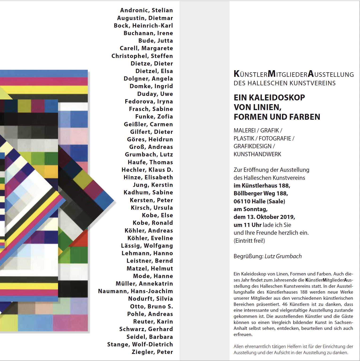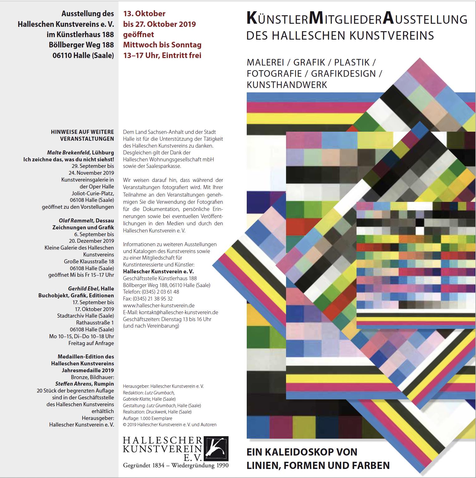 Ein Kaleidoskop von Linien, Formen und Farben - auch dieses Jahr findet zum Jahresende die KünstlerMitgliederAusstellung des Halleschen Kunstvereins statt. In der Ausstellungshalle des Künstlerhauses 188 werden neue Werke unserer Mitglieder aus den verschiedenen künstlerischen Bereichen präsentiert. 46 Künstlern ist zu danken, dass eine interessante und vielgestaltige Ausstellung zustande gekommen ist. Die ausstellenden Künstler und die Gäste können so einen Vergleich bildender Kunst in Sachsen-Anhalt selbst sehen, entdecken, beurteilen und sich erfreuen.