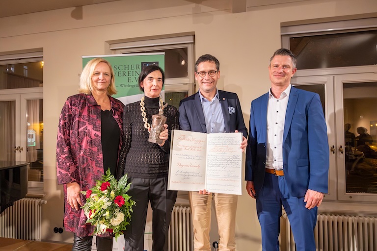 Preisverleihung mit Übergabe des Preiszeichens und der Ehrenurkunde an die Preisträgerin: (v.l.) Karola Waterstraat, 1. Vorsitzende des Halleschen Kunstvereins, Kunstpreisträgerin Dagmar Varady, Oberbürgermeister Dr. Alexander Vogt und Marco Göpel, Vorstand der Stiftung Saalesparkasse